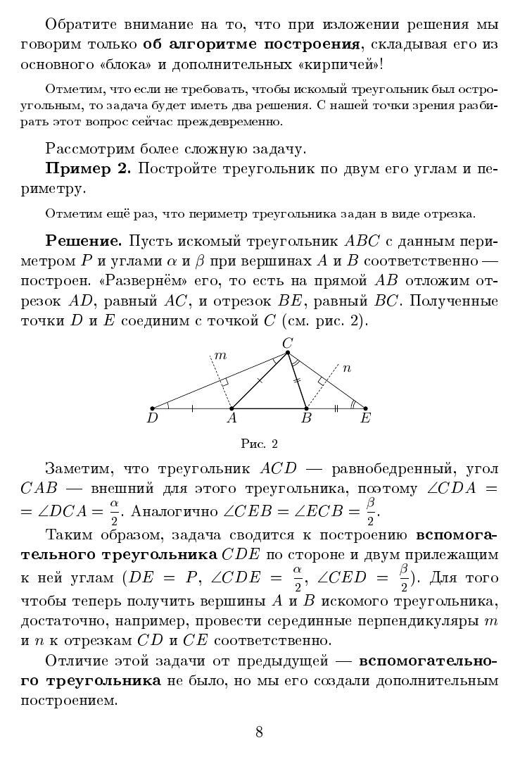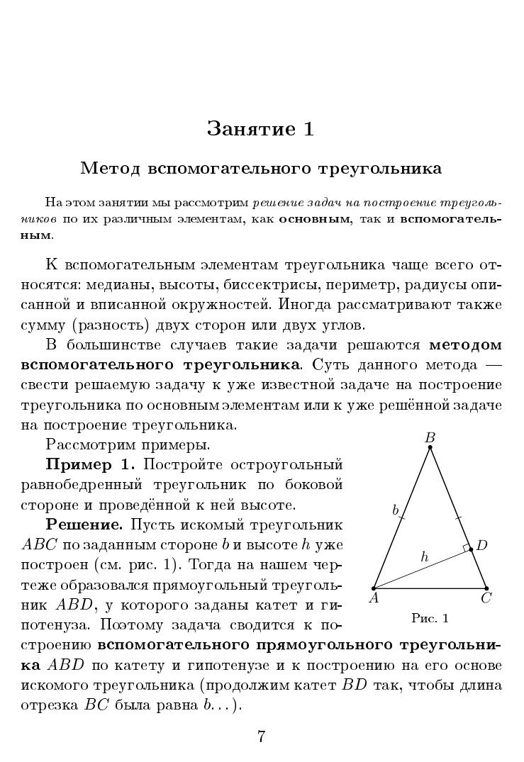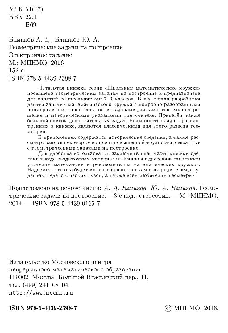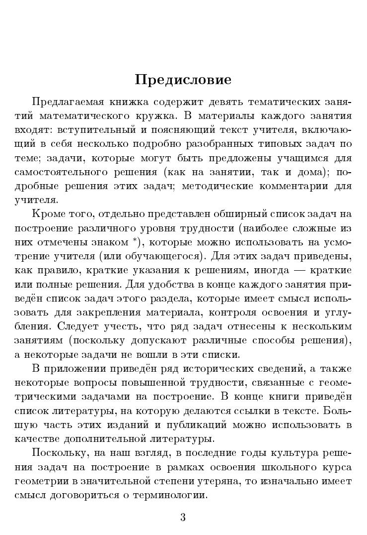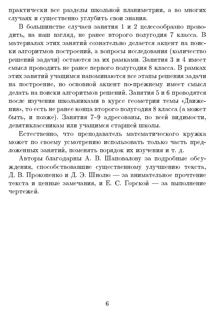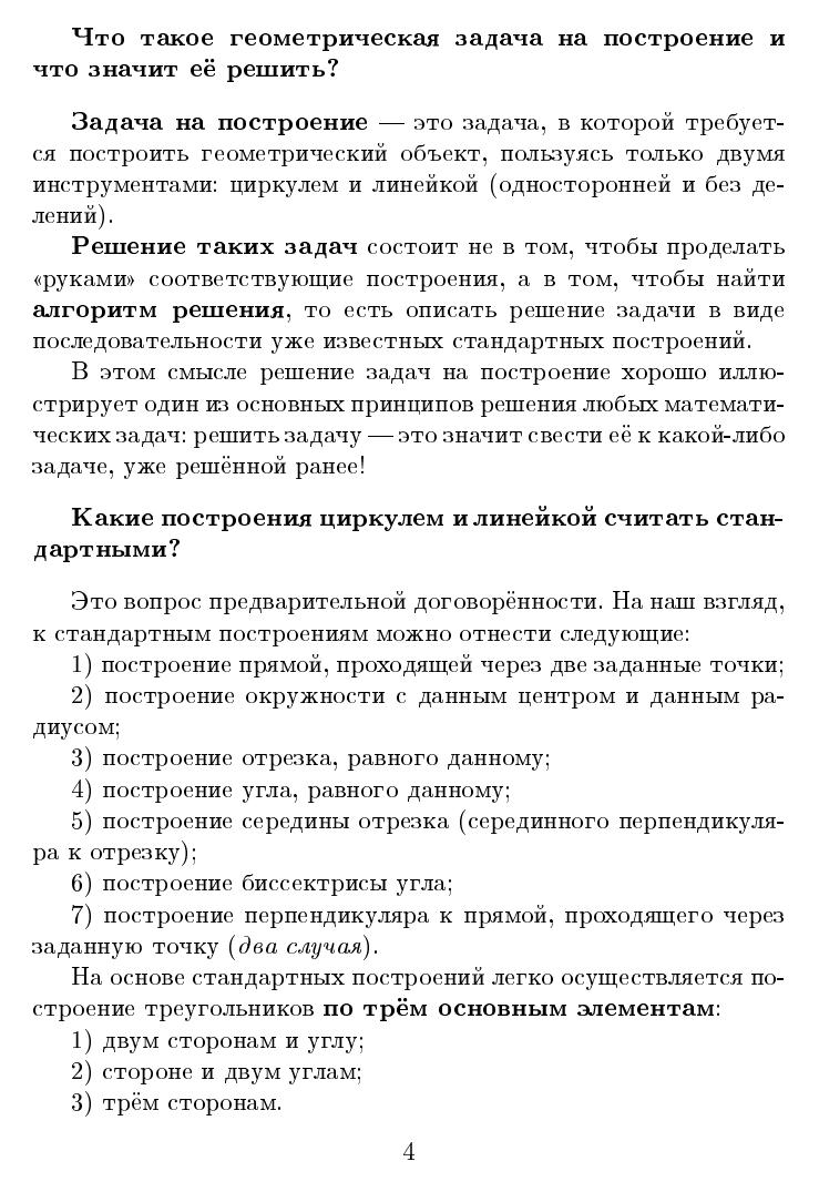 Четвёртая книжка серии «Школьные математические кружки» посвящена геометрическим задачам на построение и предназначена для занятий со школьниками 7{9 классов. В неё вошли разработки девяти занятий математического кружка с подробно разобранными примерами различной сложности, задачами для самостоятельного решения и методическими указаниями для учителя. Приведён также большой список дополнительных задач. Большинство задач, рассмотренных в книжке, являются классическими для этого раздела геометрии. В приложениях содержатся исторические сведения, а также рассматриваются некоторые вопросы повышенной трудности, связанные с геометрическими задачами на построение. Для удобства использования заключительная часть книжки сделана в виде раздаточных материалов. Книжка адресована школьным учителям математики и руководителям математических кружков. Надеемся, что она будет интересна школьникам и их родителям, студентам педагогических вузов, а также всем любителям геометрии.