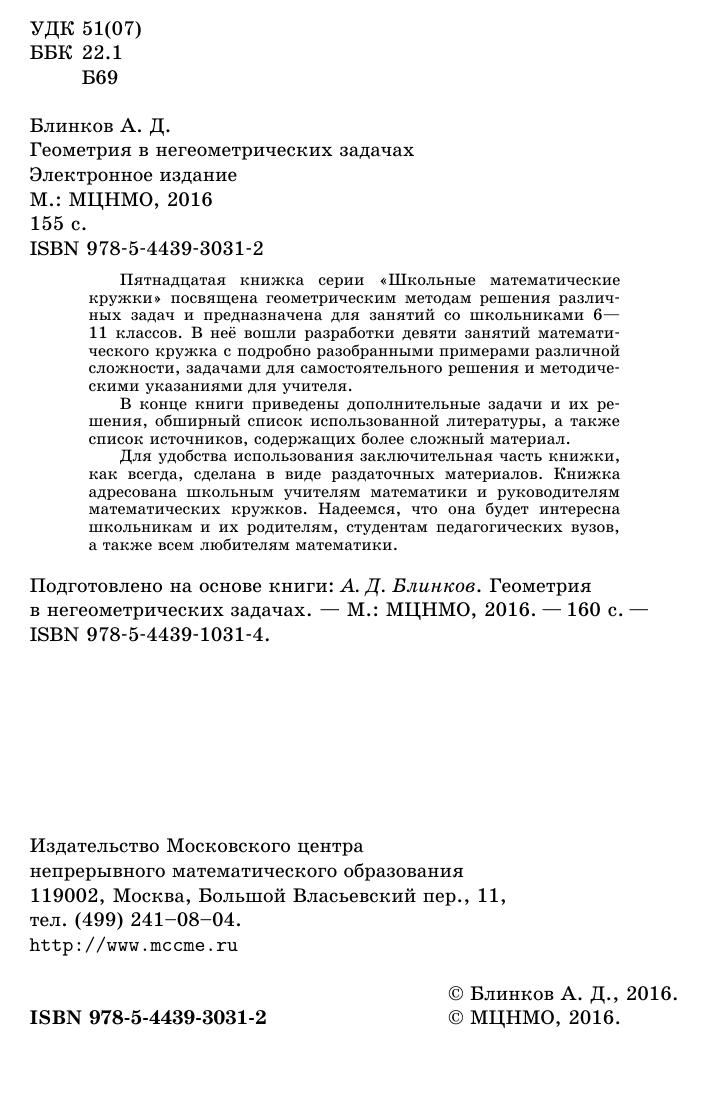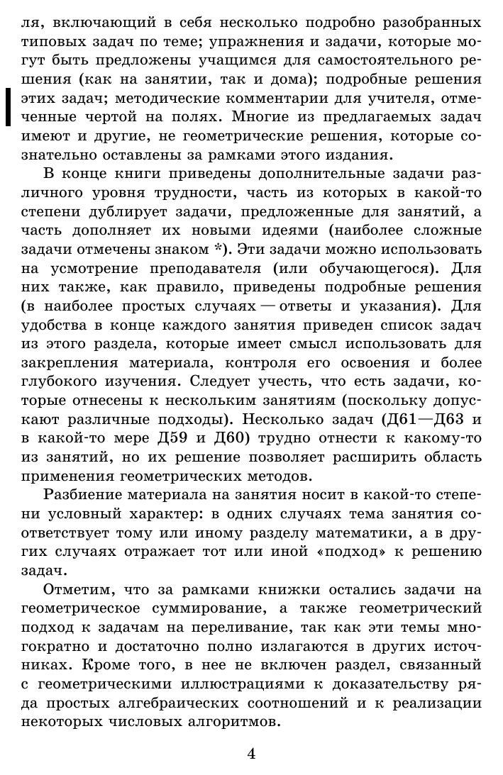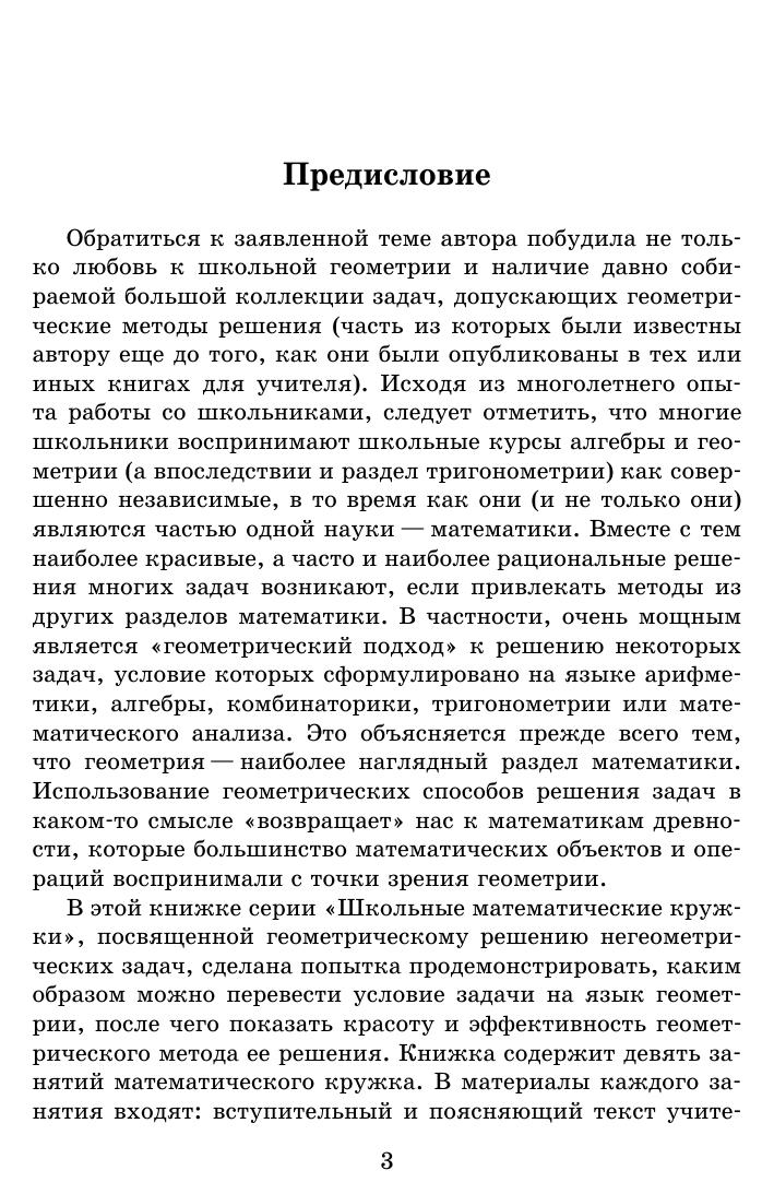 Пятнадцатая книжка серии «Школьные математические кружки» посвящена геометрическим методам решения различных задач и предназначена для занятий со школьниками 6—11 классов. В неё вошли разработки девяти занятий математического кружка с подробно разобранными примерами различной сложности, задачами для самостоятельного решения и методическими указаниями для учителя. В конце книги приведены дополнительные задачи и их решения, обширный список использованной литературы, а также список источников, содержащих более сложный материал. Для удобства использования заключительная часть книжки, как всегда, сделана в виде раздаточных материалов. Книжка адресована школьным учителям математики и руководителям математических кружков. Надеемся, что она будет интересна школьникам и их родителям, студентам педагогических вузов, а также всем любителям математики.