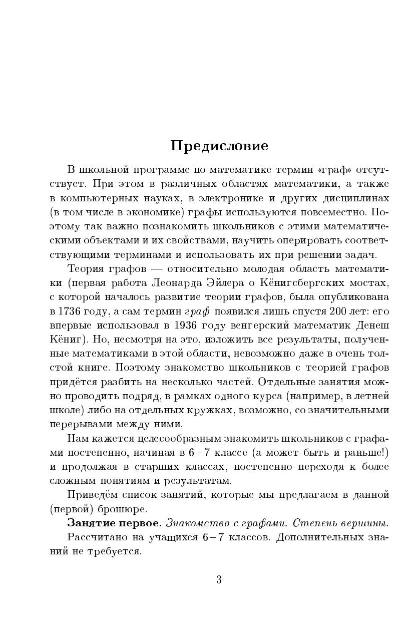 Вторая брошюра серии ШКОЛЬНЫЕ МАТЕМАТИЧЕСКИЕ КРУЖКИ посвящена графам. В ней приведены четыре занятия по этой теме, в которых подобран материал для начального знакомства с графами, адресованный школьникам 6–8 классов и руководителям кружков. Несмотря на то, что в школьном курсе математики термин «граф» отсутствует, авторам представляется важным познакомить школьников с этими объектами, научить оперировать соответствующими терминами и использовать их при решении задач. В дальнейшем предполагается выпустить еще несколько брошюр, в которых эта тема будет развиваться для старших школьников. Надеемся, что книжка будет интересна также учителям математики, студентам педагогических вузов и всем, кто занимается со школьниками.