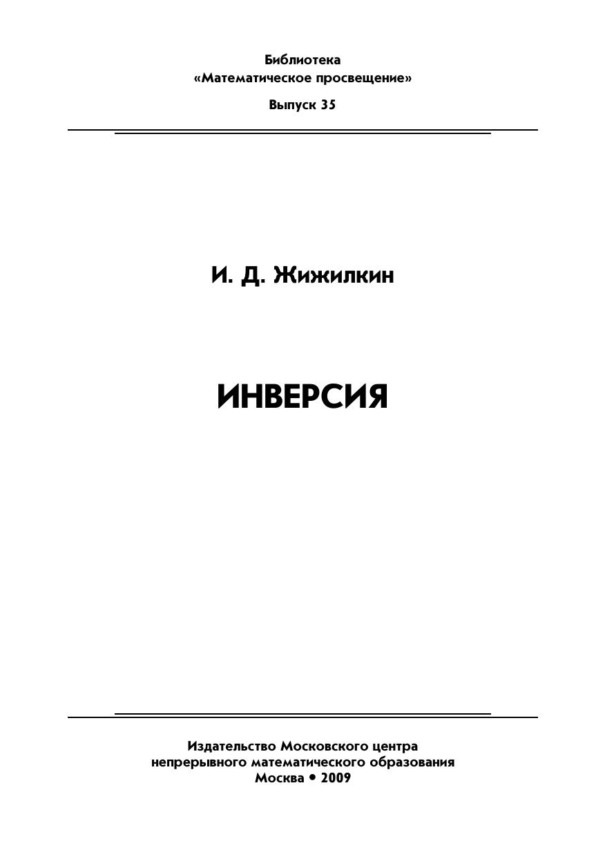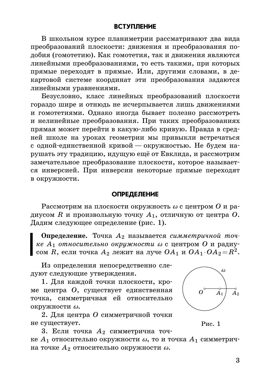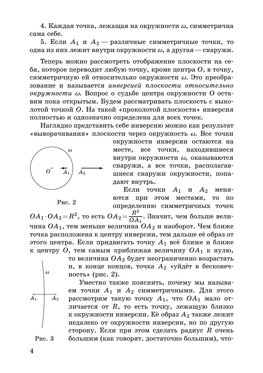 Инверсия — отображение плоскости на себя, которое может переводить окружности в прямые. С одной стороны, это помогает решать «школьные» геометрические задачи, особенно те, в которых речь идёт о многих пересекающихся или касающихся окружностях. В то же время знакомство с инверсией необходимо для дальнейшего изучения таких разделов математики, как комплексный анализ и геометрия Лобачевского.После определения и вывода основных свойств инверсии в брошюре разбираются классические задачи Архимеда, Паппа, Аполлония. Рассказывается также об инверсии пространства, стереографической проекции сферы на плоскость, пучках окружностей и сфер, что приводит к доказательству знаменитой теоремы Понселе.Материал брошюры рассчитан на старшеклассников, учителей математики и всех интересующихся элементарной геометрией.Брошюра написана по мотивам лекции, прочитанной автором на Малом мехмате 28 февраля 2004 года.