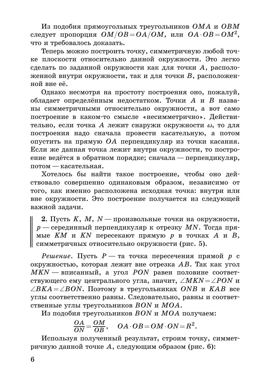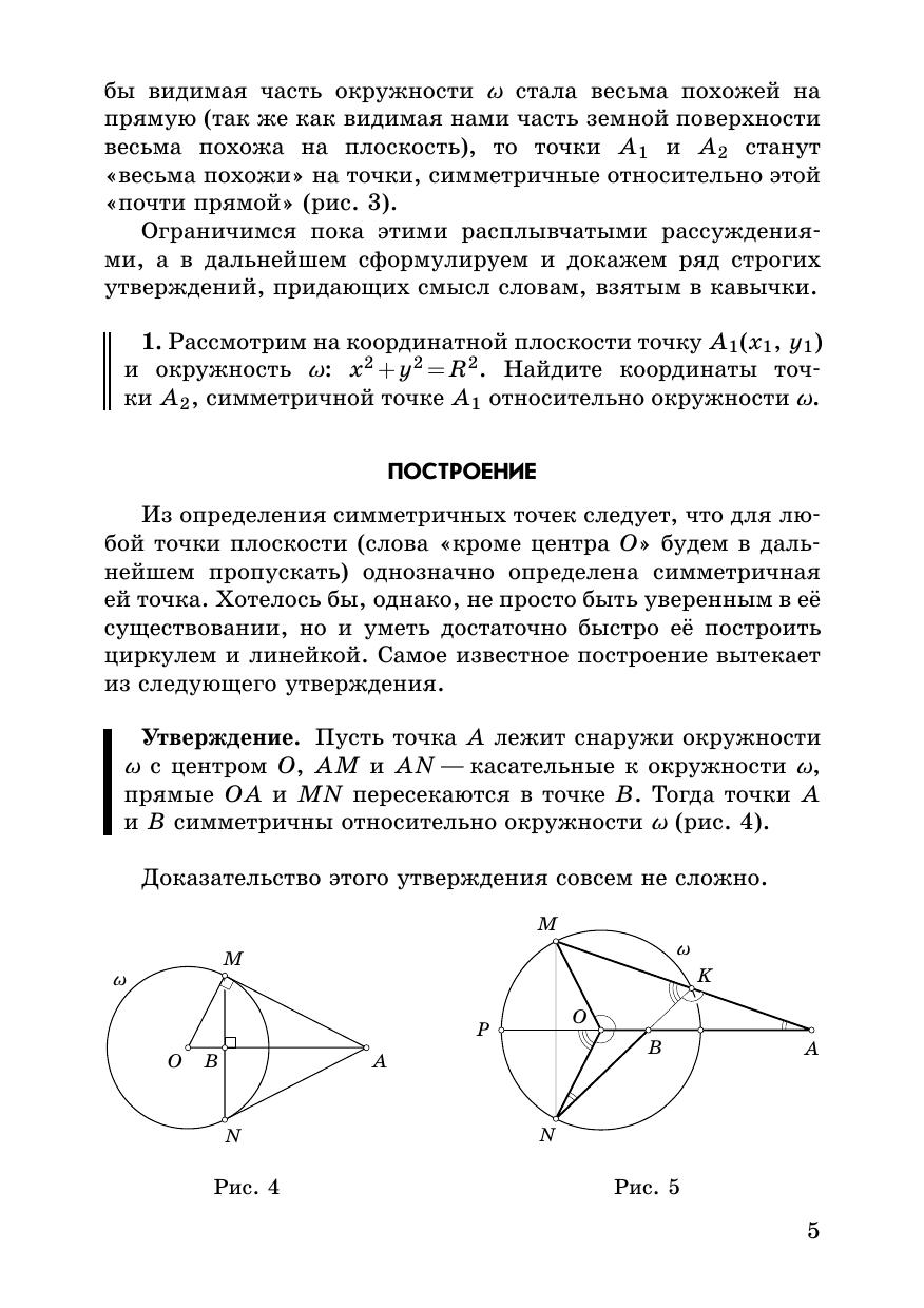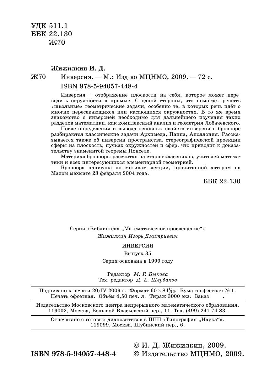 Инверсия — отображение плоскости на себя, которое может переводить окружности в прямые. С одной стороны, это помогает решать «школьные» геометрические задачи, особенно те, в которых речь идёт о многих пересекающихся или касающихся окружностях. В то же время знакомство с инверсией необходимо для дальнейшего изучения таких разделов математики, как комплексный анализ и геометрия Лобачевского.После определения и вывода основных свойств инверсии в брошюре разбираются классические задачи Архимеда, Паппа, Аполлония. Рассказывается также об инверсии пространства, стереографической проекции сферы на плоскость, пучках окружностей и сфер, что приводит к доказательству знаменитой теоремы Понселе.Материал брошюры рассчитан на старшеклассников, учителей математики и всех интересующихся элементарной геометрией.Брошюра написана по мотивам лекции, прочитанной автором на Малом мехмате 28 февраля 2004 года.