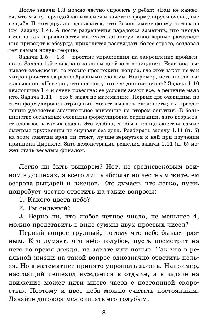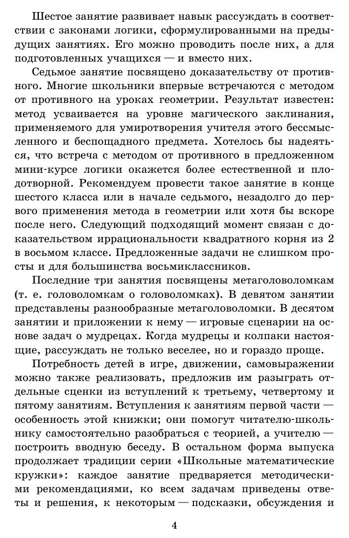 Четырнадцатая книжка серии «Школьные математические кружки» посвящена логическим задачам и является продолжением ранее вышедшей книжки И. В. Раскиной и Д. Э. Шноля «Логические задачи» (выпуск 11). В книжку вошли разработки десяти занятий математического кружка с примерами задач различного уровня сложности, задачами для самостоятельного решения и методическими указаниями для учителя. Приведен также большой список дополнительных задач. Ко всем задачам приведены ответы и подробные решения или указания к решениям. Особенностью книжки является наличие игровых сценариев к отдельным задачам и целому занятию, реализация которых поможет лучшему освоению материала. Для удобства использования заключительная часть книжки сделана в виде раздаточных материалов. Книжка адресована школьным учителям математики и руководителям математических кружков. Надеемся, что она будет интересна школьникам и их родителям, студентам педагогических вузов, а также всем любителям логики.