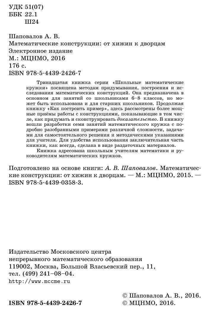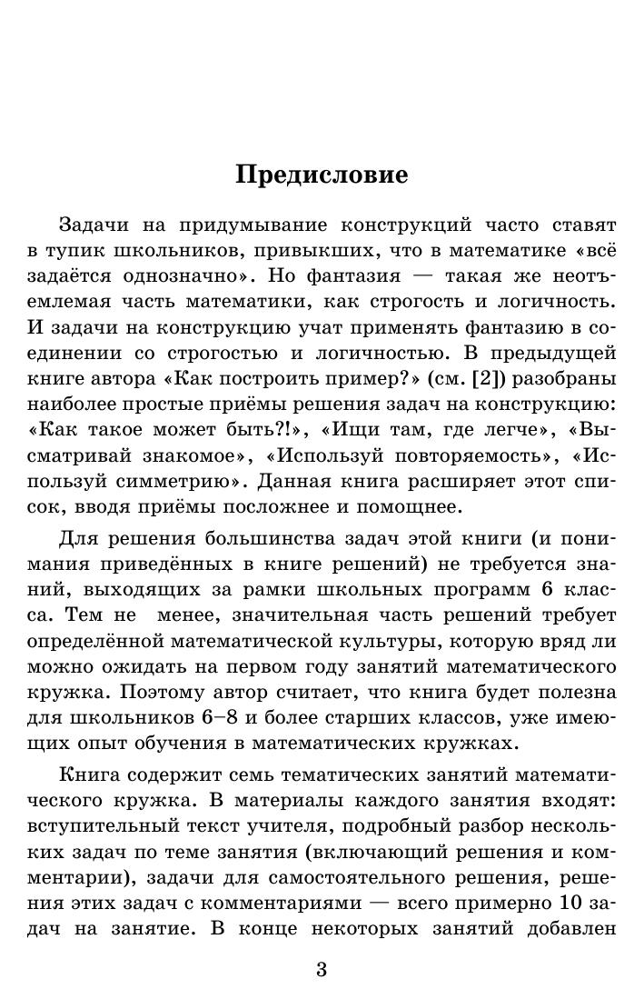 Тринадцатая книжка серии «Школьные математические кружки» посвящена методам придумывания, построения и исследования математических конструкций. Она предназначена в основном для занятий со школьниками 6–8 классов, но может быть использована и для старших школьников. Продолжая книжку «Как построить пример», здесь рассмотрены более мощные приёмы работы с конструкциями, показывающие в том числе, как придумать и сконструировать доказательство. В книжку вошли разработки семи занятий математического кружка с подробно разобранными примерами различной сложности, задачами для самостоятельного решения и методическими указаниями для учителя. Для удобства использования заключительная часть книжки, как всегда, сделана в виде раздаточных материалов. Книжка адресована школьным учителям математики и руководителям математических кружков.