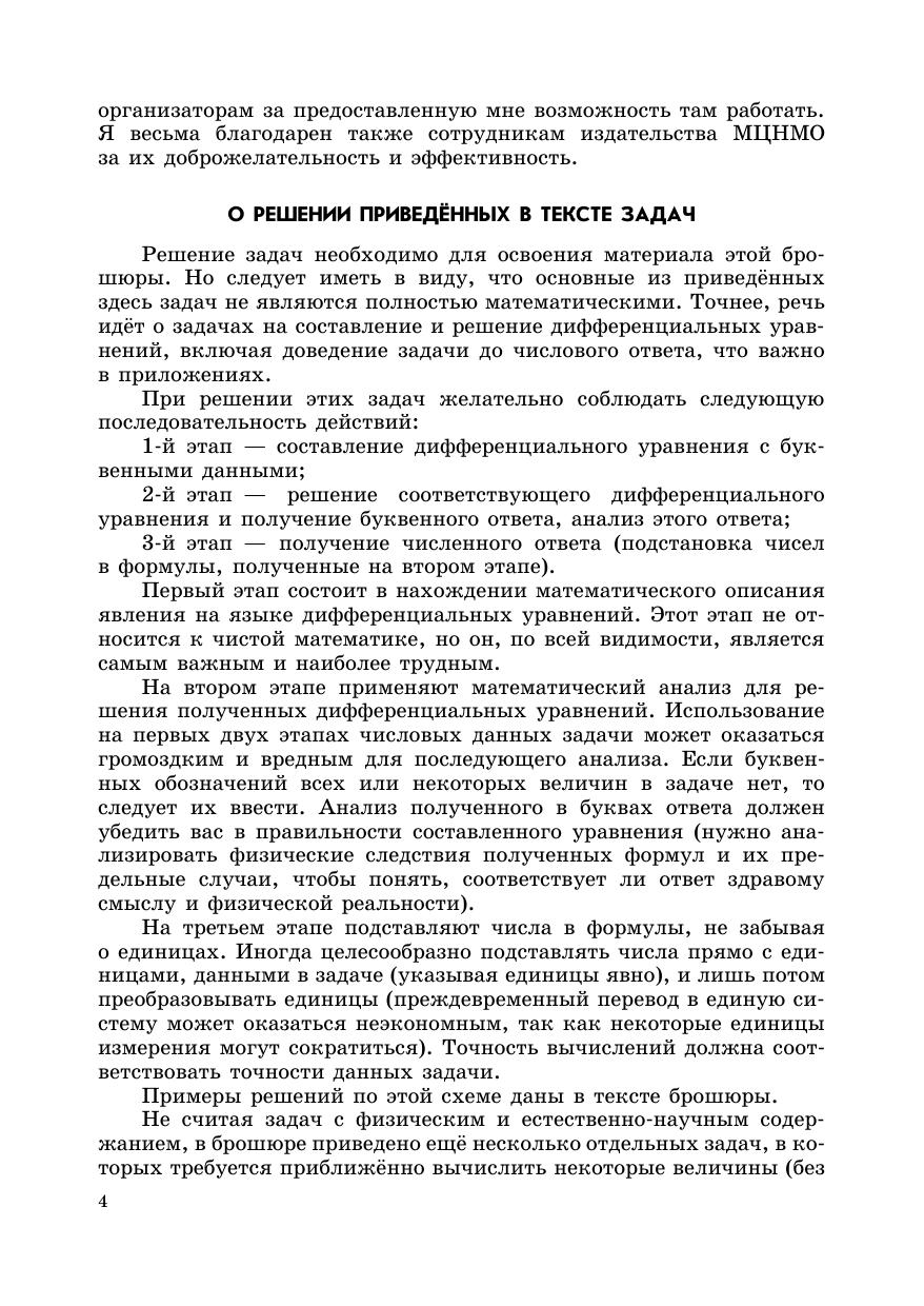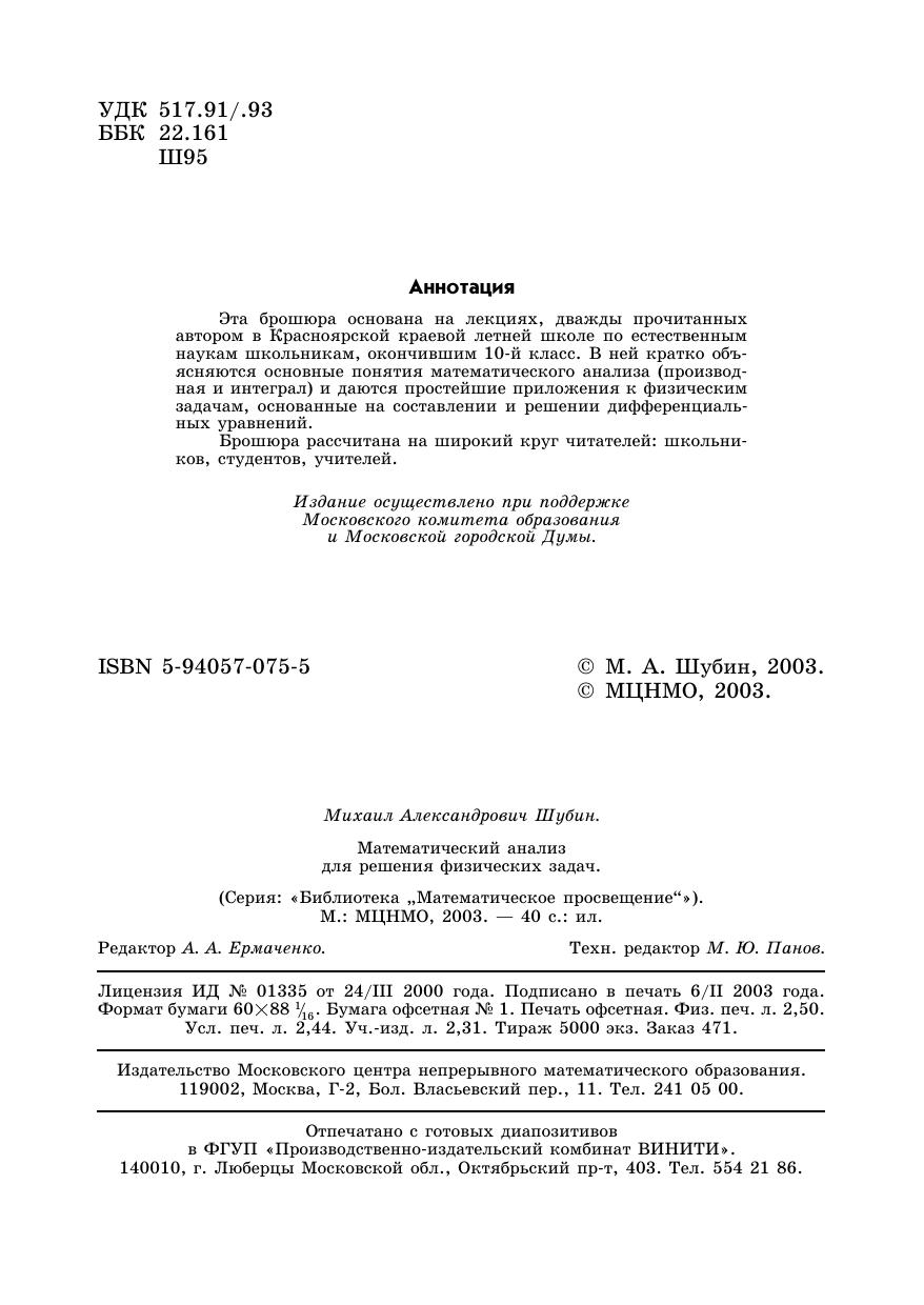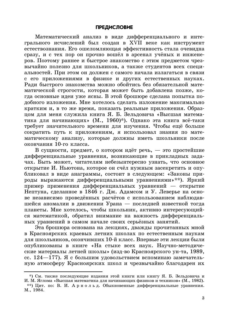 Эта брошюра основана на лекциях, дважды прочитанных автором в Красноярской краевой летней школе по естественным наукам школьникам, окончившим 10-й класс. В ней кратко объясняются основные понятия математического анализа (производная и интеграл) и даются простейшие приложения к физическим задачам, основанные на составлении и решении дифференциальных уравнений.Брошюра рассчитана на широкий круг читателей: школьников, студентов, учителей.