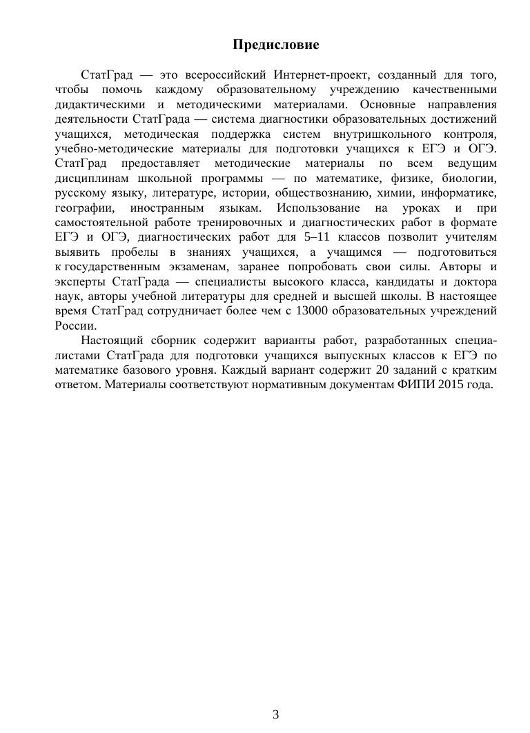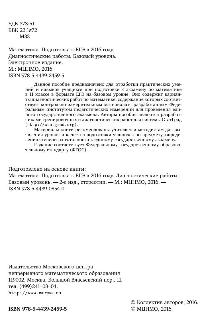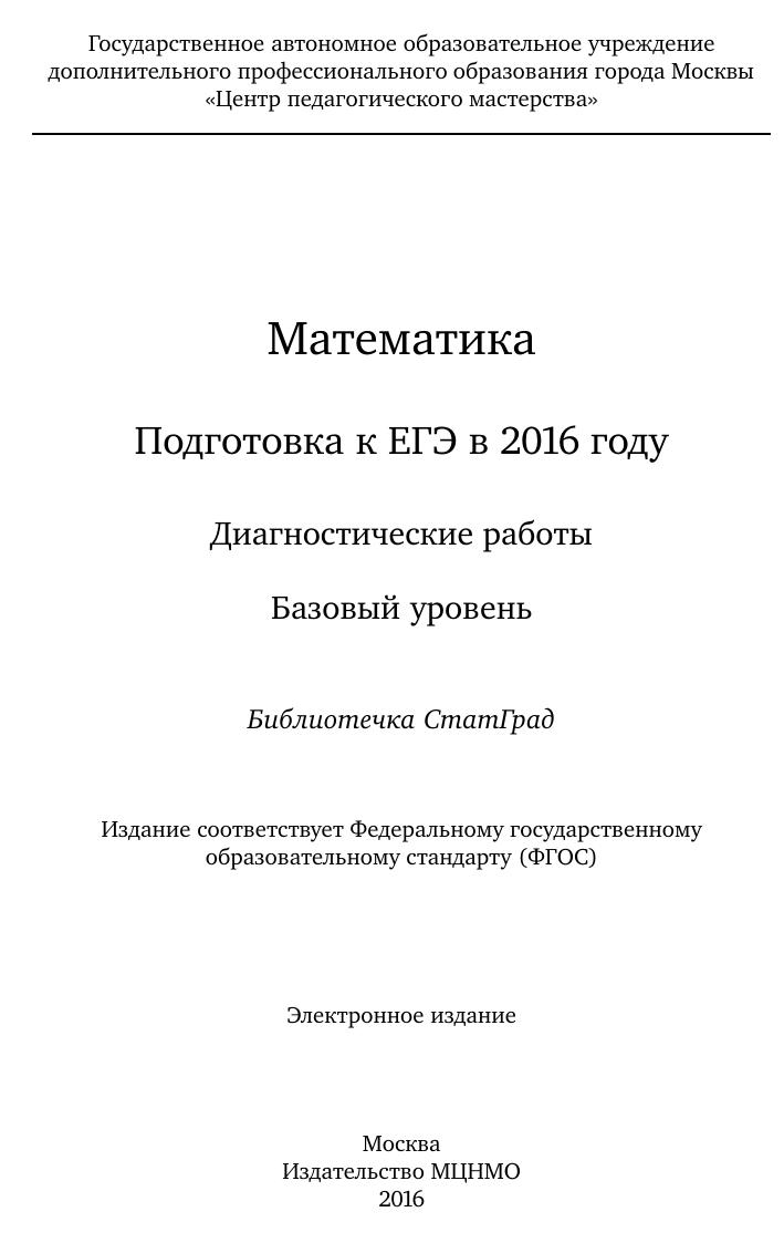 Данное пособие предназначено для отработки практических умений и навыков учащихся при подготовке к экзамену по математике в 11 классе в формате ЕГЭ на базовом уровне. Оно содержит варианты диагностических работ по математике, содержание которых соответствует контрольно-измерительным материалам, разработанным Федеральным институтом педагогических измерений для проведения единого государственного экзамена. Авторы пособия являются разработчиками тренировочных и диагностических работ для системы СтатГрад (http://statgrad.org). Материалы книги рекомендованы учителям и методистам для выявления уровня и качества подготовки учащихся по предмету, определения степени их готовности к единому государственному экзамену. Издание соответствует Федеральному государственному образовательному стандарту (ФГОС).