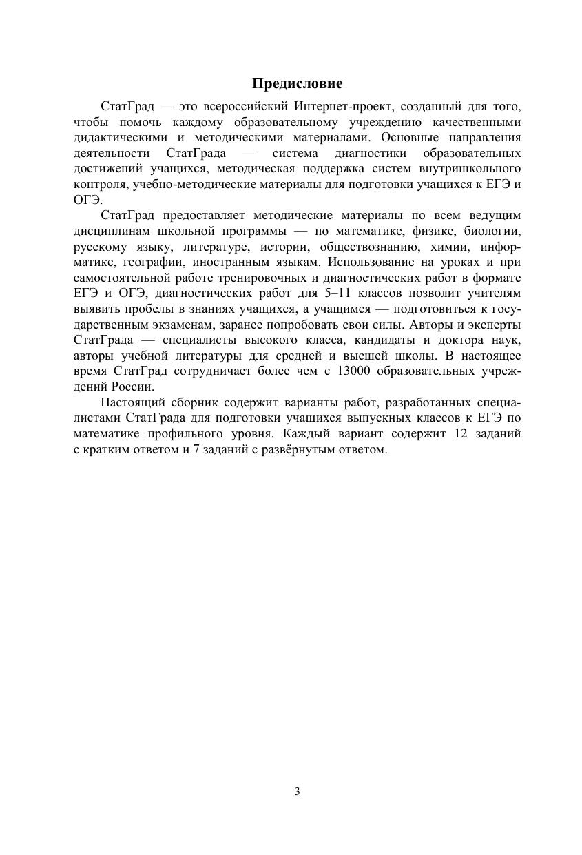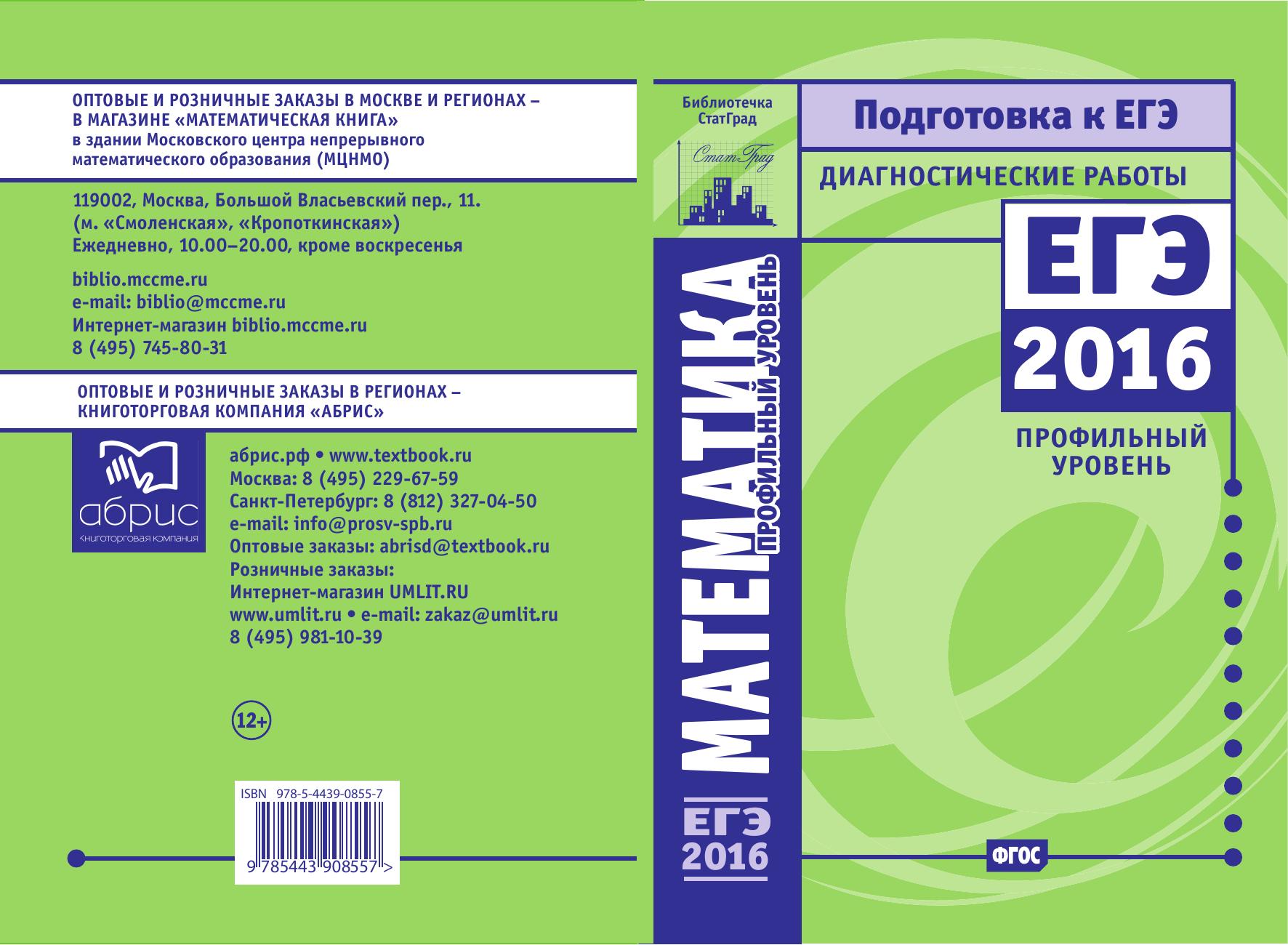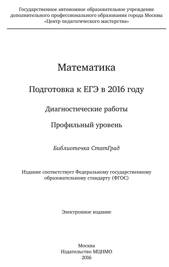 Данное пособие предназначено для отработки практических умений и навыков учащихся при подготовке к экзамену по математике в 11 классе в формате ЕГЭ на профильном уровне. Оно содержит варианты диагностических работ по математике, содержание которых соответствует контрольно- измерительным материалам, разработанным Федеральным институтом педагогических измерений для проведения единого государственного экзамена. В книгу входят также ответы к заданиям и критерии проверки и оценивания выполнения заданий с развёрнутым ответом. Авторы пособия являются разработчиками тренировочных и диагностических работ для системы СтатГрад (http://statgrad.org). Материалы книги рекомендованы учителям и методистам для выявления уровня и качества подготовки учащихся по предмету, определения степени их готовности к единому государственному экзамену. Издание соответствует Федеральному государственному образовательному стандарту (ФГОС).