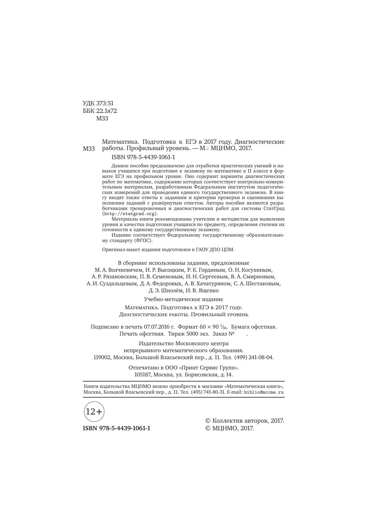 Математика. Подготовка к ЕГЭ в 2017 году. Диагностические работы. Профильный уровень.