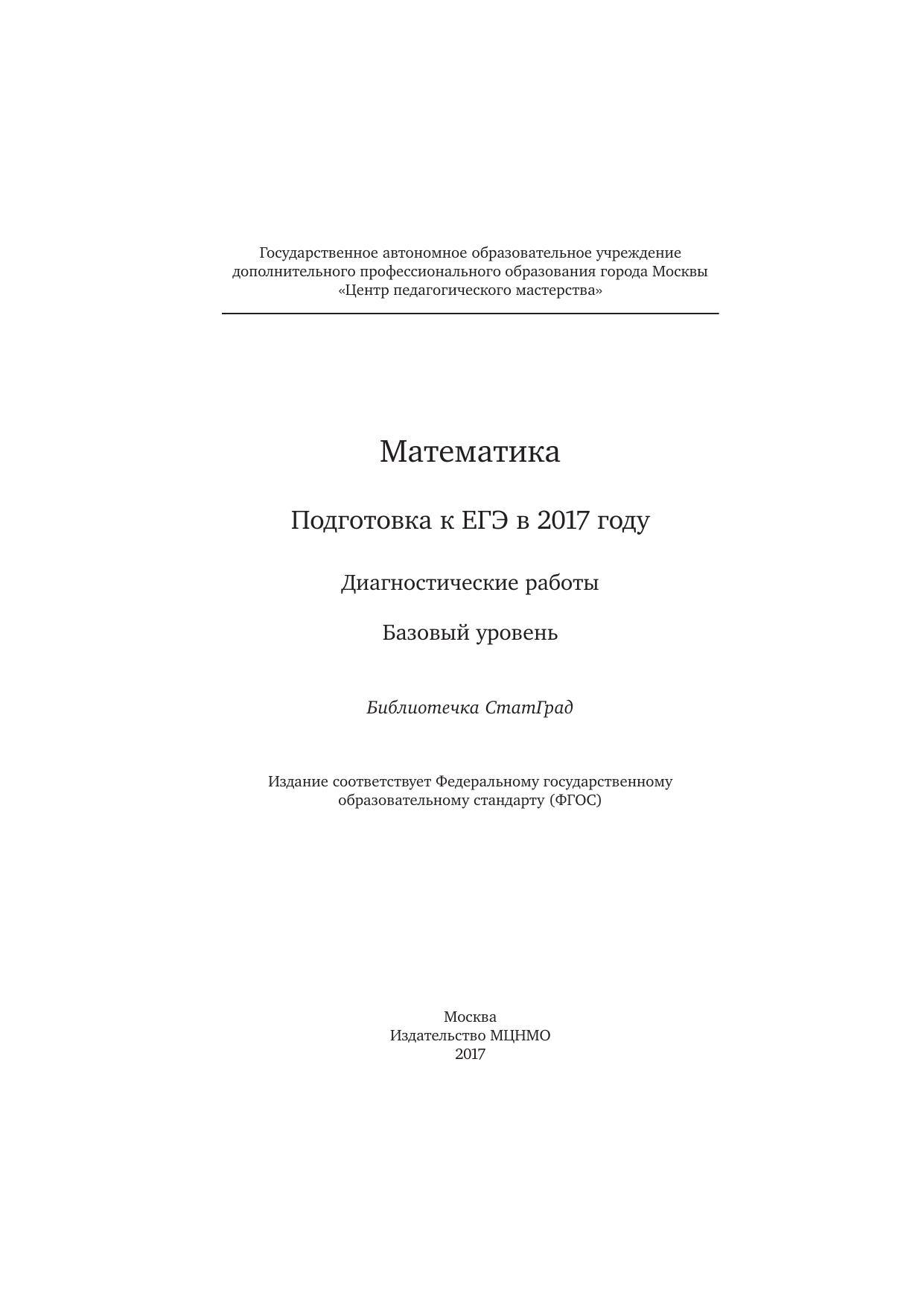 Математика. Подготовка к ЕГЭ в 2017 году. Диагностические работы. Базовый уровень.