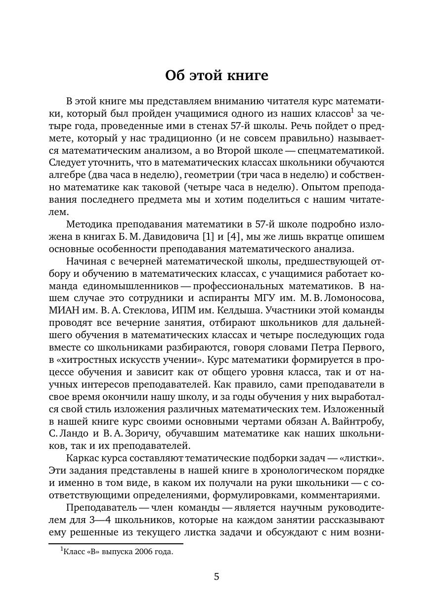 В этой книге мы представляем вниманию читателя курс математики, который был пройден учащимися класса «В» выпуска 2006 г. за четыре года, проведенные ими в стенах 57-й школы.Каркас курса составляют тематические подборки задач — «листки». Эти задания представлены в нашей книге в хронологическом порядке и именно в том виде, в каком их получали на руки школьники — с соответствующими определениями, формулировками, комментариями.
