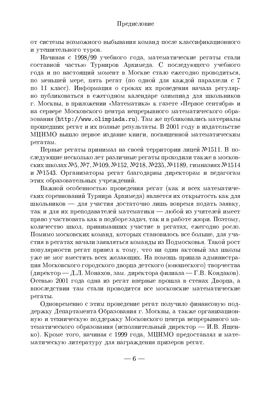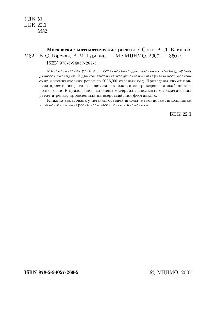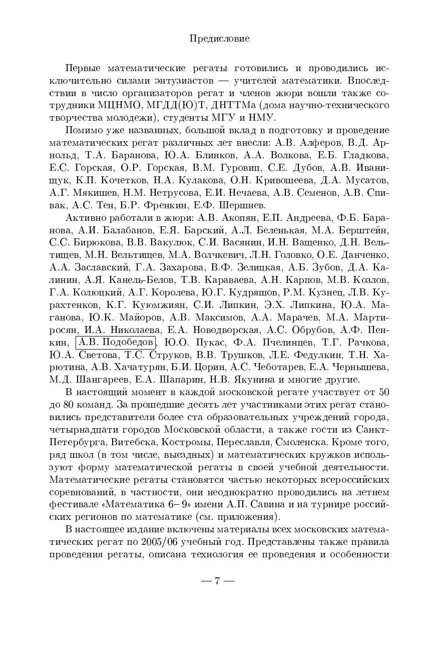 Математическая регата — соревнование для школьных команд, проводящееся ежегодно. В данном сборнике представлены материалы всех московских математических регат по 2005/06 учебный год. Приведены также правила проведения регаты, описана технология ее проведения и особенности подготовки. В приложение включены материалы школьных математических регат и регат, проведенных на всероссийских фестивалях.Книжка адресована учителям средней школы, методистам, школьникам и может быть интересна всем любителям математики.