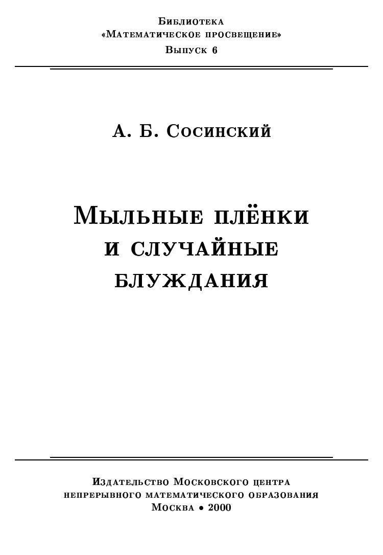 Взаимное влияние математики и её приложений проиллюстрировано на примере задачи о мыльной плёнке, затягивающей проволочный контур. Приближённое решение этой задачи можно получить оригинальным способом, который, на первый взгляд, никак не связан с её постановкой, а именно методом моделирования случайных блужданий.Текст брошюры представляет собой обработку записи лекции, прочитанной автором 10 декабря 1999 года для участников III Международного математического турнира старшеклассников «Кубок памяти А. Н. Колмогорова»—школьников 8—11 классов (запись Е. Н. Осьмовой, под редакцией Р. М. Кузнеца).Брошюра рассчитана на широкий круг читателей, интересующихся математикой: школьников старших классов, студентов младших курсов, учителей.