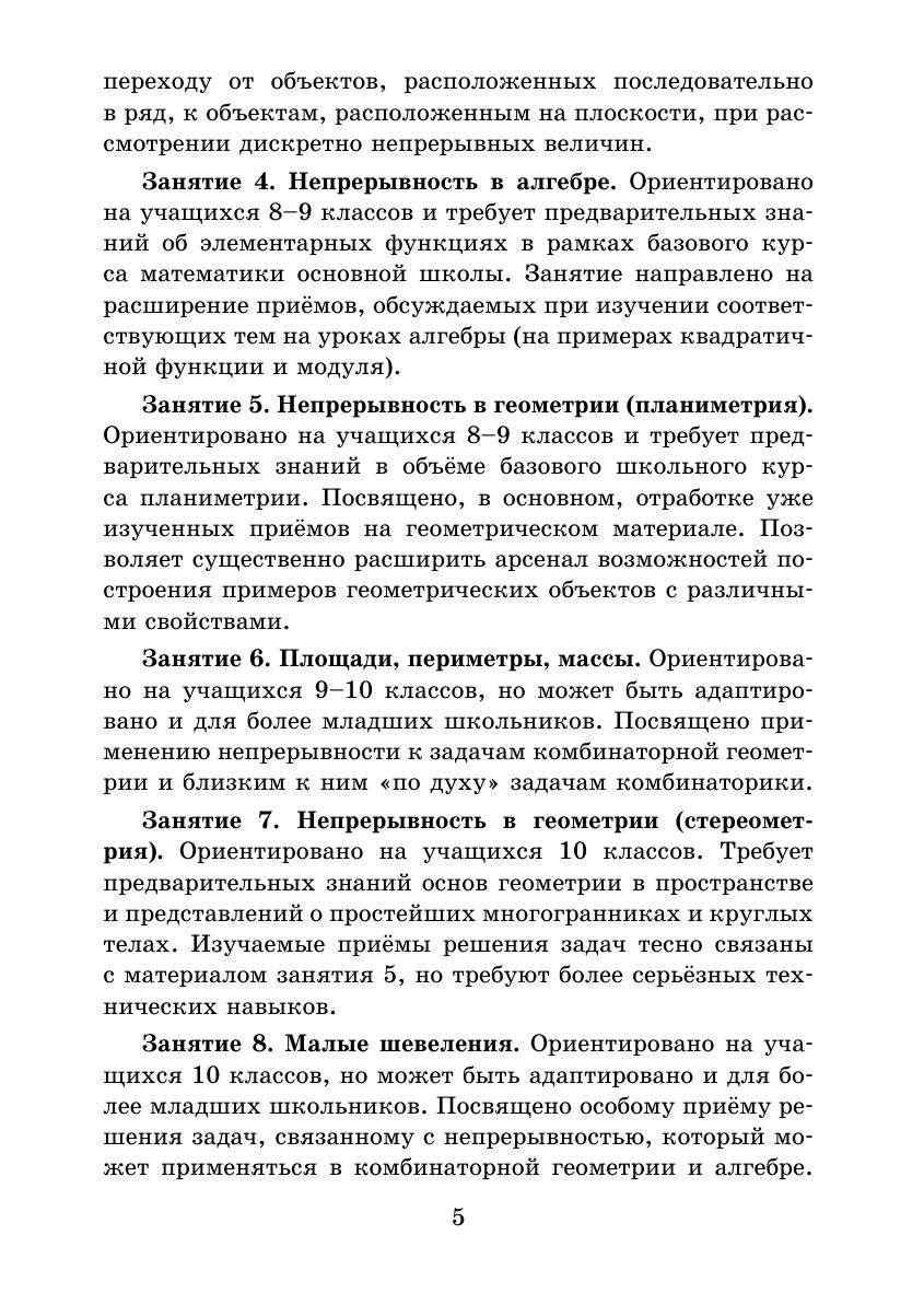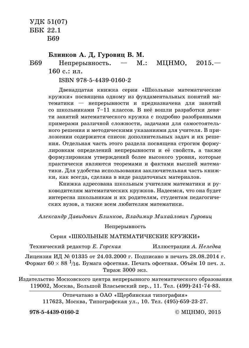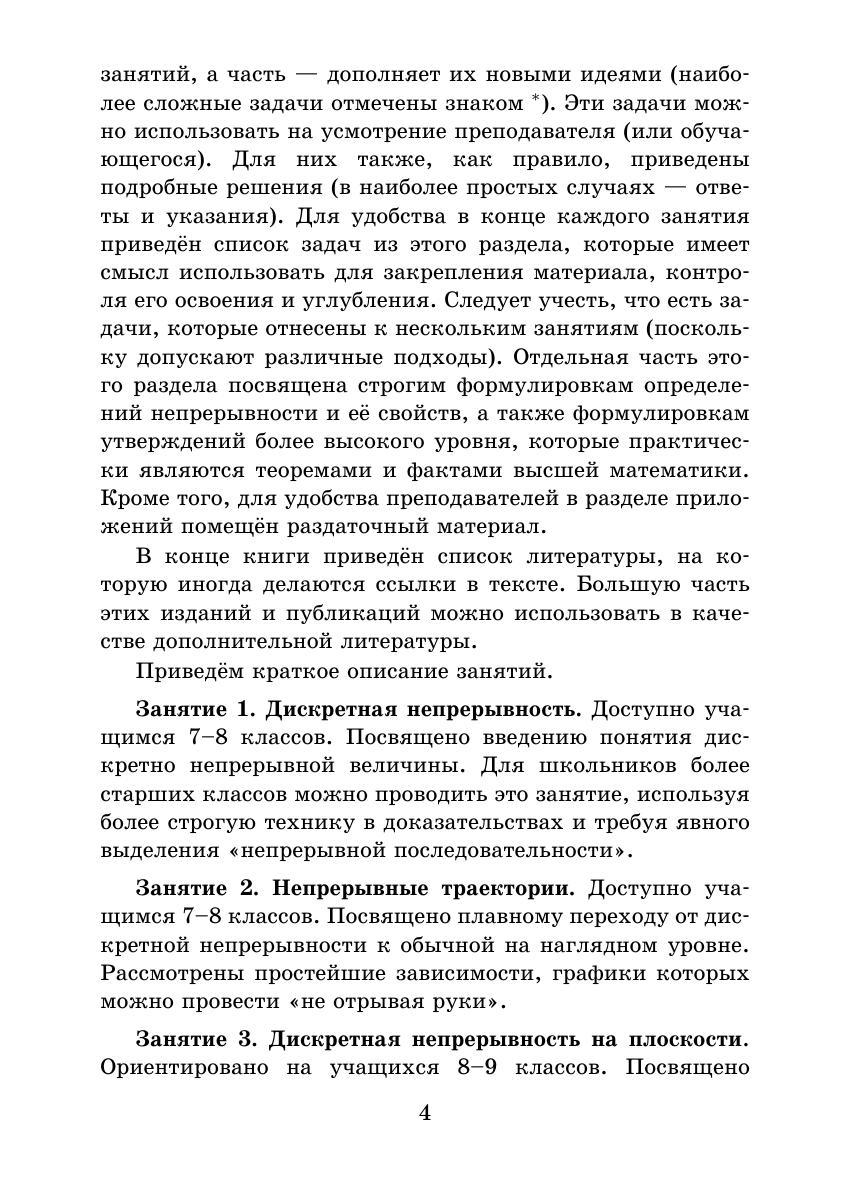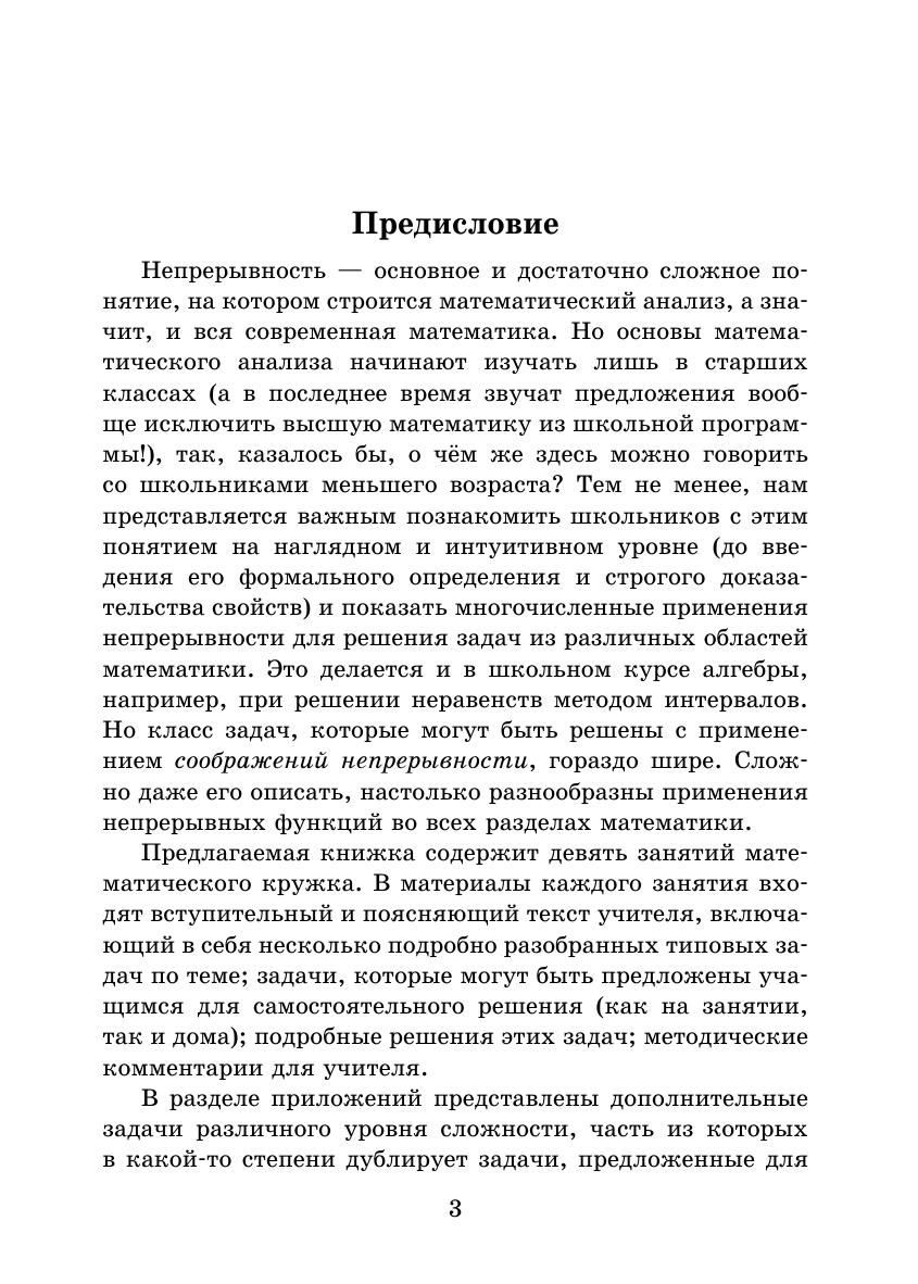 Двенадцатая книжка серии «Школьные математические кружки» посвящена одному из фундаментальных понятий математики — непрерывности и предназначена для занятий со школьниками 7–11 классов. В неё вошли разработки девяти занятий математического кружка с подробно разобранными примерами различной сложности, задачами для самостоятельного решения и методическими указаниями для учителя. В приложении содержится список дополнительных задач и их решения. Отдельная часть этого раздела посвящена строгим формулировкам определений непрерывности и её свойств, а также формулировкам утверждений более высокого уровня, которые практически являются теоремами и фактами высшей математики. Для удобства использования заключительная часть книжки, как всегда, сделана в виде раздаточных материалов. Книжка адресована школьным учителям математики и руководителям математических кружков. Надеемся, что она будет интересна школьникам и их родителям, студентам педагогических вузов, а также всем любителям математики.