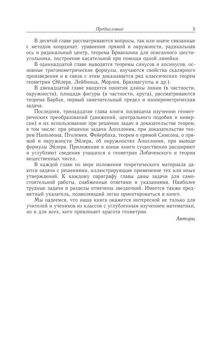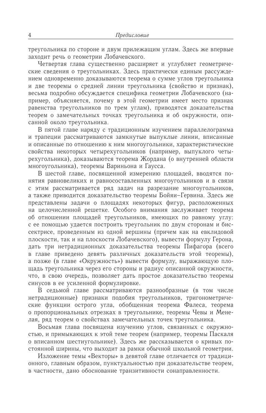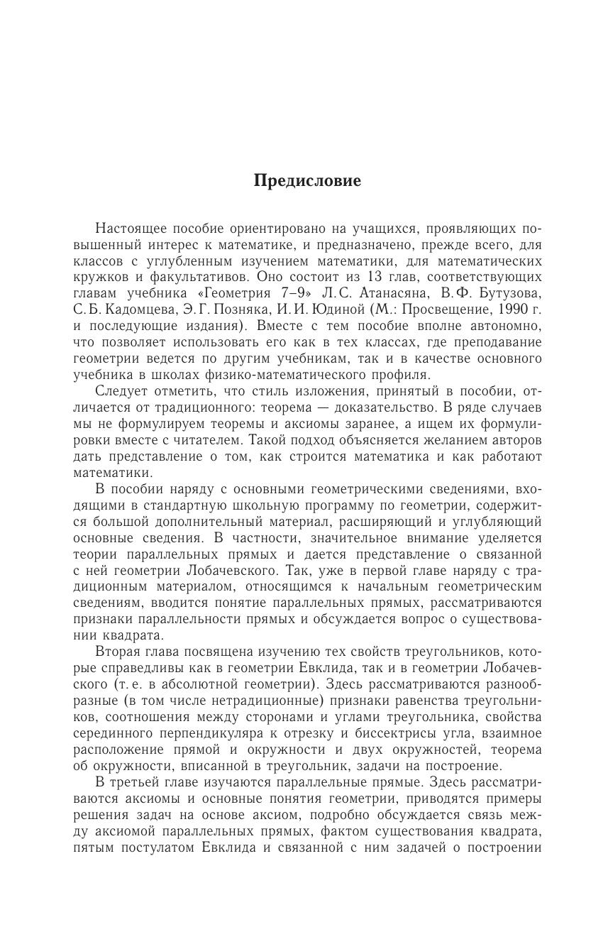 В настоящем пособии дается систематическое изложение углубленного курса планиметрии. Наряду с основными геометрическими сведениями, входящими в стандартную школьную программу по геометрии, содержится большой дополнительный материал, расширяющий и углубляющий основные сведения. Стиль изложения, принятый в пособии, заметно отличается от традиционного: теорема — доказательство. В ряде случаев авторы не формулируют теоремы и аксиомы заранее, а ищут их формулировки вместе с читателем. Такой подход объясняется желанием авторов дать представление о том, как строится математика и как работают математики. В книге значительное внимание уделяется геометрии Лобачевского, кривым постоянной ширины, изопериметрическим задачам, доказывается целый ряд замечательных теорем планиметрии. Пособие ориентировано на учащихся, проявляющих повышенный интерес к математике, а также всех, кого привлекает красота геометрии. Оно может использоваться в классах с углубленным изучением математики, в работе математических кружков и факультативов, служить основным учебником в школах физико-математического профиля.