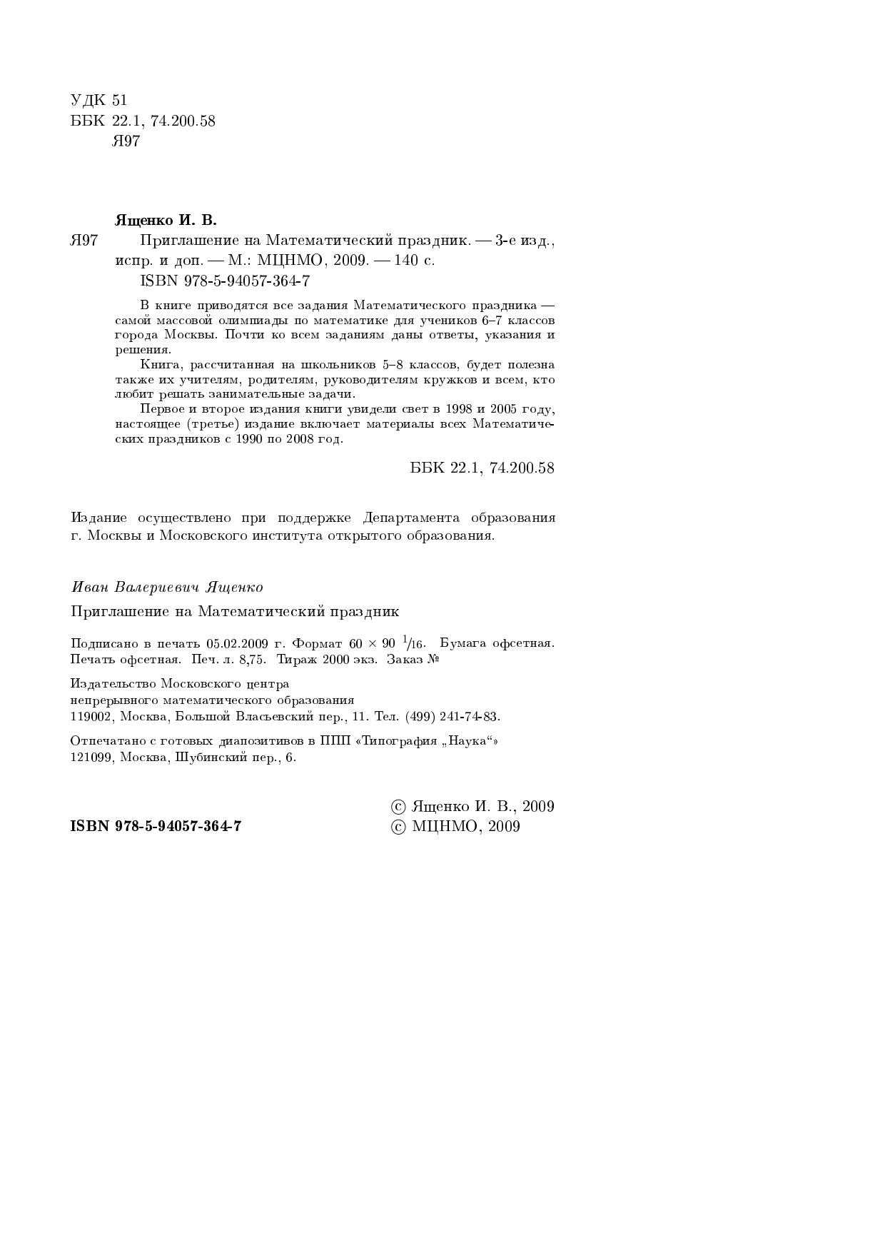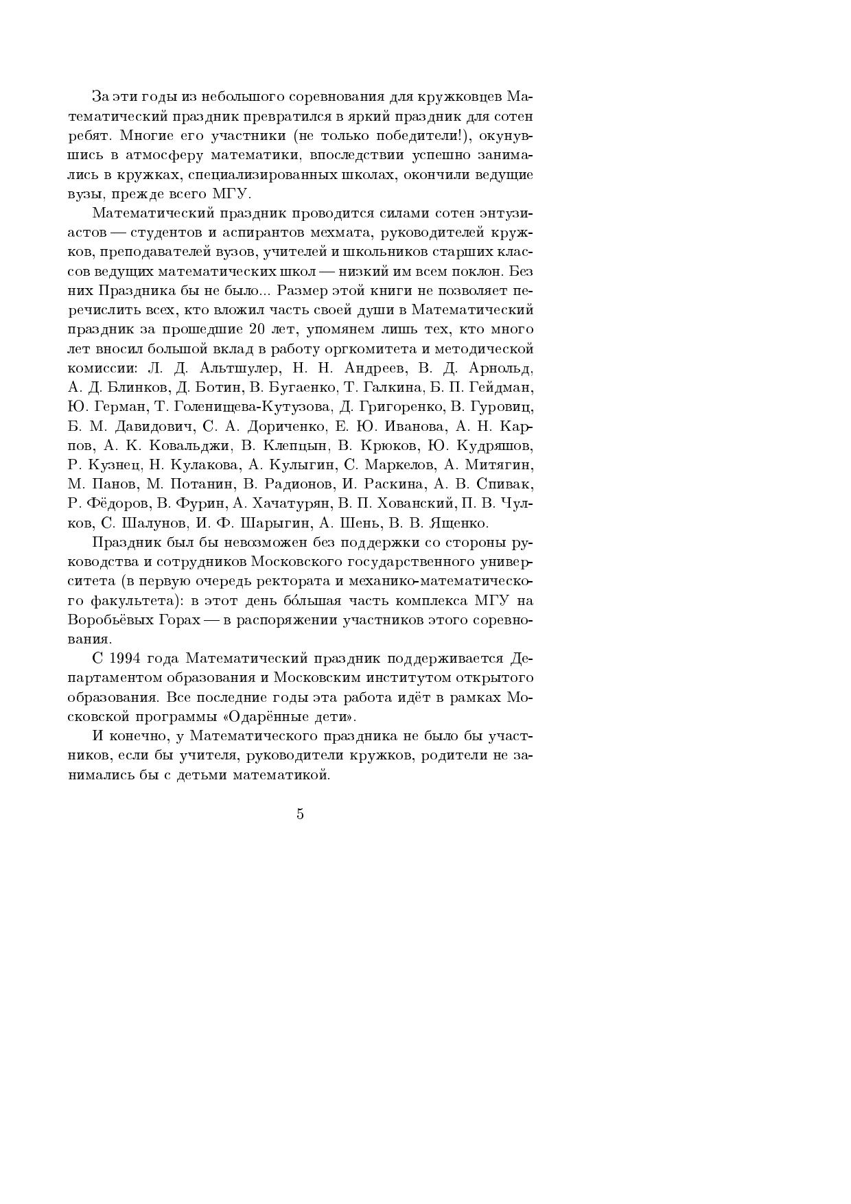 В книге приводятся все задания Математического праздника — самой массовой олимпиады по математике для учеников 6–7 классов города Москвы. Почти ко всем заданиям даны ответы, указания и решения.Книга, рассчитанная на школьников 5–8 классов, будет полезна также их учителям, родителям, руководителям кружков, а также всем, кто любит решать занимательные задачи.Первое и второе издания книги увидели свет в 1998 и 2005 году, настоящее (третье) издание включает материалы всех Математических праздников с 1990 по 2008 год.