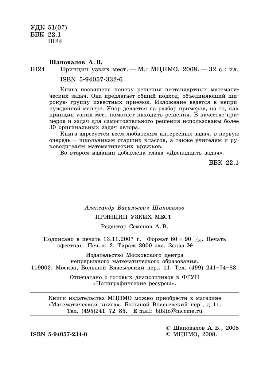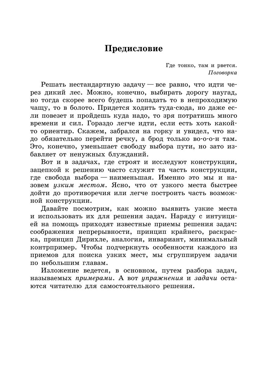 Книга посвящена поиску решения нестандартных математических задач. Она предлагает общий подход, объединяющий широкую группу известных приемов. Изложение ведется в непринужденной манере. Упор делается на разбор примеров, на то, как принцип узких мест помогает находить решения. В качестве примеров и задач для самостоятельного решения использованы более 30 оригинальных задач автора.Книга адресуется всем любителям интересных задач, в первую очередь—школьникам старших классов, а также учителям и руководителям математических кружков.По сравнению со вторым изданием, выходившим в 2008 году, добавлена глава «Как такое может быть?» и расширен список задач.