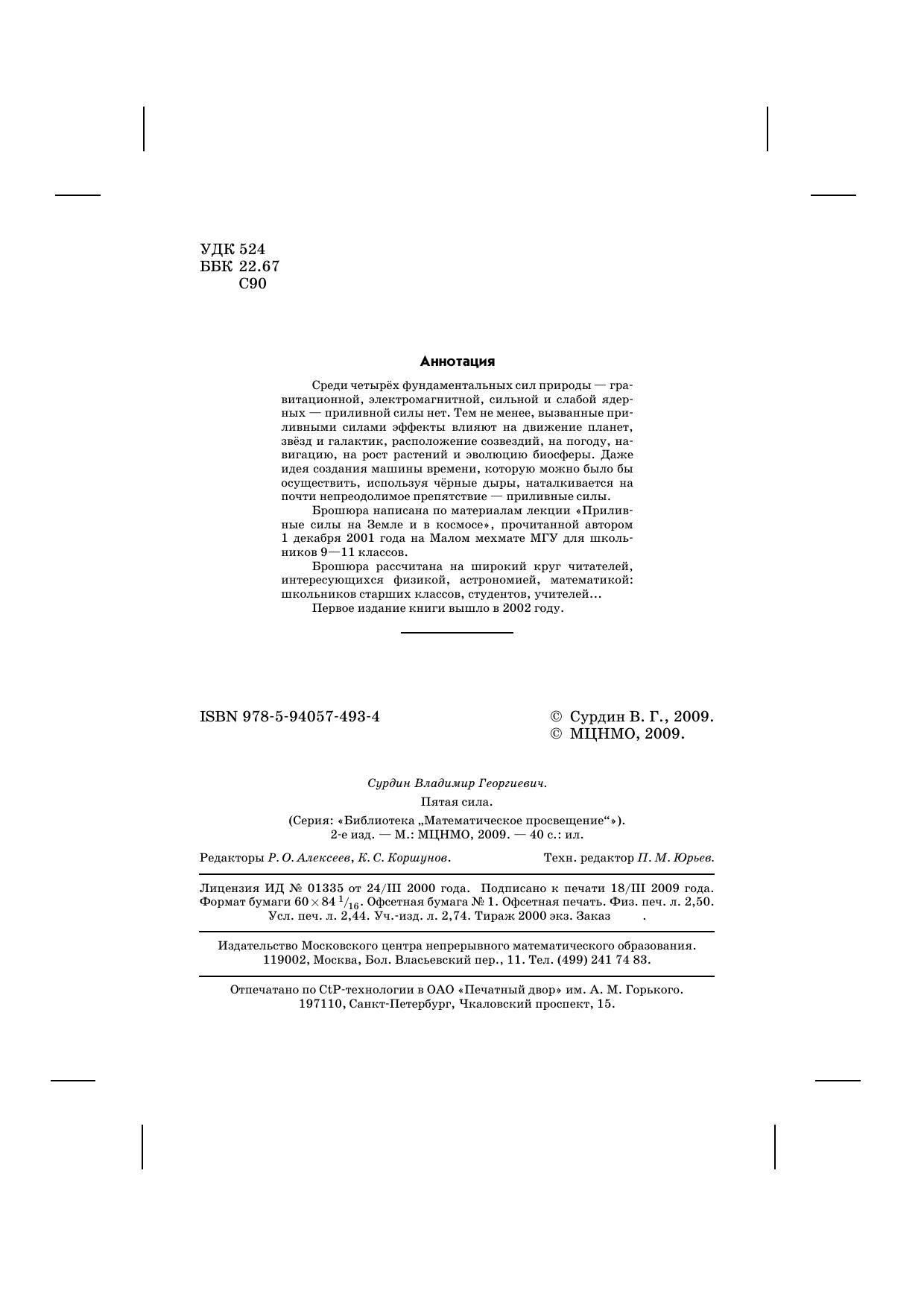 Среди четырёх фундаментальных сил природы —г равитационной, электромагнитной, сильной и слабой ядерных — приливной силы нет. Тем не менее, вызванные приливными силами эффекты влияют на движение планет, звёзд и галактик, расположение созвездий, на погоду, навигацию, на рост растений и эволюцию биосферы. Даже идея создания машины времени, которую можно было бы осуществить, используя чёрные дыры, наталкивается на почти непреодолимое препятствие — приливные силы.Брошюра написана по материалам лекции «Приливные силы на Земле и в космосе», прочитанной автором 1 декабря 2001 года на Малом мехмате МГУ для школьников 9–11 классов.Брошюра рассчитана на широкий круг читателей, интересующихся физикой, астрономией, математикой: школьников старших классов, студентов, учителей...Первое издание книги вышло в 2002 году.