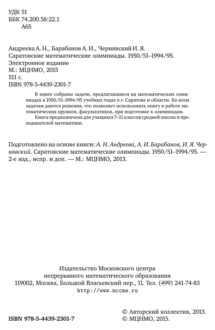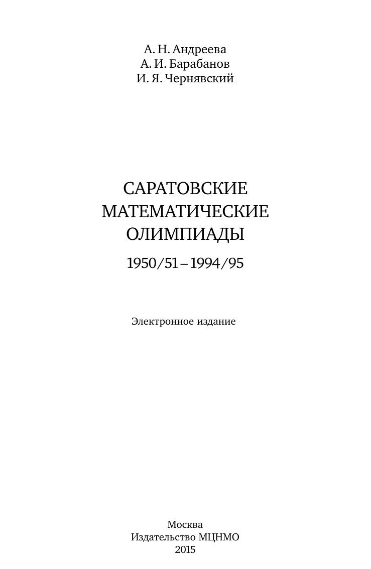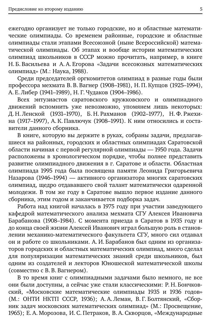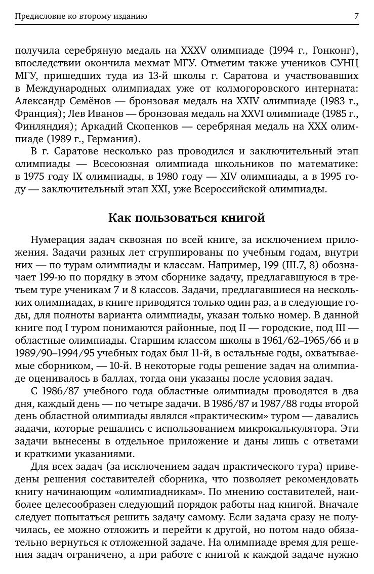 В книге собраны задачи, предлагавшиеся на математических олимпиадах в 1950/51–1994/95 учебных годах в г. Саратове и области. Ко всем задачам даются решения, что позволяет использовать книгу в работе математических кружков, факультативов, при подготовке к олимпиадам. Книга предназначена для учащихся 7–11 классовсреднейшколыи преподавателей математики.