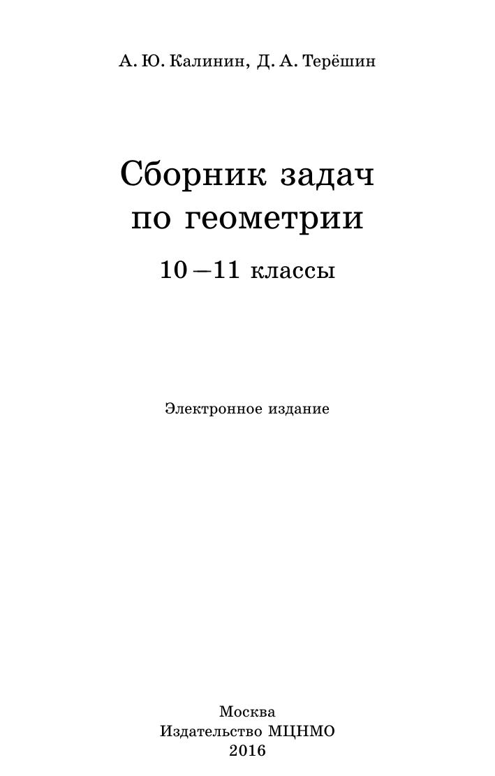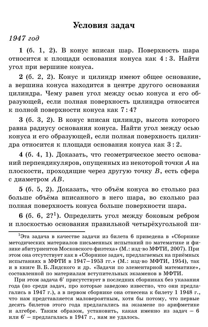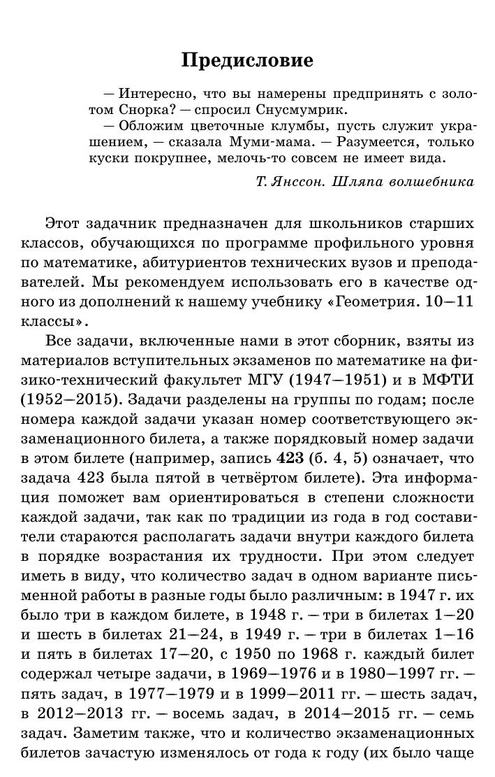 Задачник рекомендуется использовать как дополнение к учебнику А.Ю. Калинина, Д.А. Терёшина «Геометрия. 10– 11 классы». В нём собраны задачи из вступительных экзаменов по математике на физико-технический факультет МГУ (1947– 1951)