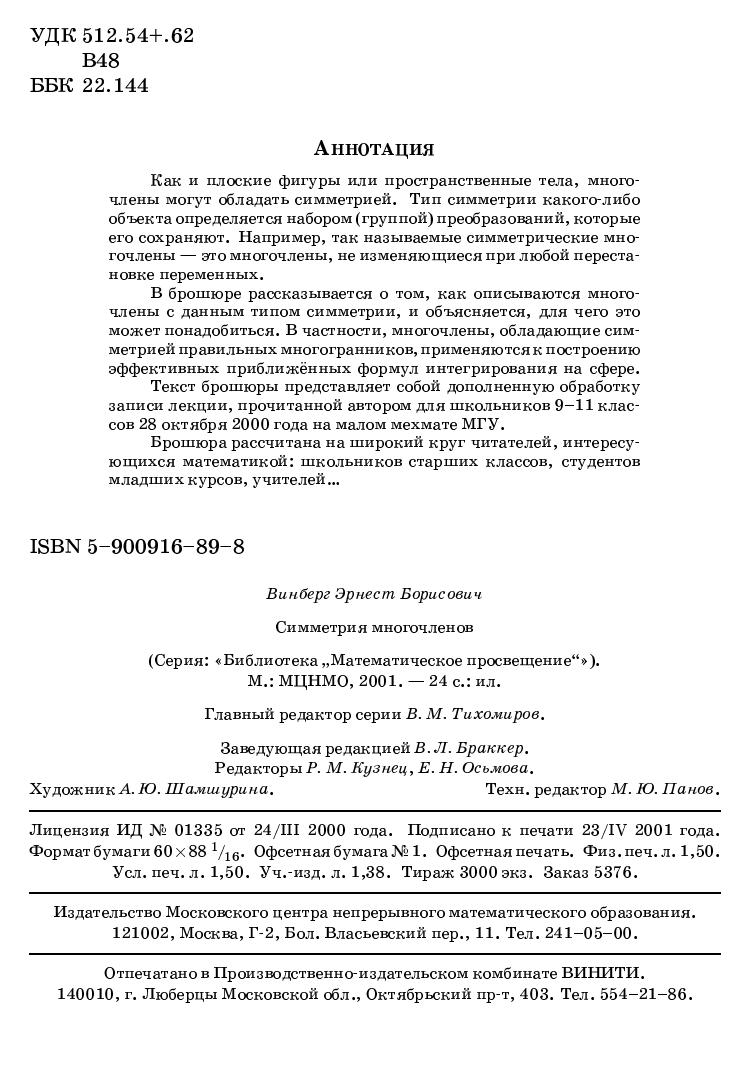Как и плоские фигуры или пространственные типы, многочлены могут обладать симметрией. Тип симметрии какого-либо объекта определяется набором (группой) преобразований, которые его сохраняют. Например, так называемые симметрические многочлены — это многочлены, не изменяющиеся при любой перестановке переменных. В брошюре рассказывается о том, как описываются многочлены с данным типом симметрии, и объясняется, для чего это может понадобиться. В частности, многочлены, обладающие симметрией правильных многогранников, применяются к построению эффективных приближенных формул интегрирования на сфере.Текст брошюры представляет собой дополненную обработку записи лекции, прочитанной автором для школьников 9–11 классов 28 октября 2000 года на малом мехмате МГУ.Брошюра рассчитана на широкий круг читателей, интересующихся математикой: школьников старших классов, студентов младших курсов, учителей.