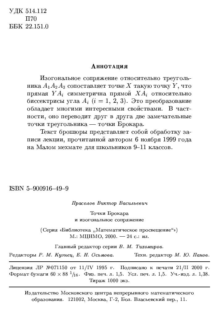 Изогональное сопряжение относительно треугольника A1A2A3 сопоставляет точке X такую точку Y, что прямая YAi симметрична прямой XAi относительно биссектрисы угла Ai (i=1, 2, 3). Это преобразование обладает многими интересными свойствами. В частности, оно переводит друг в друга две замечательные точки треугольника - точки Брокара.Текст брошюры представляет собой обработку записи лекции, прочитанной автором 6 ноября 1999 года на Малом мехмате для~школьников 9 - 11 классов.