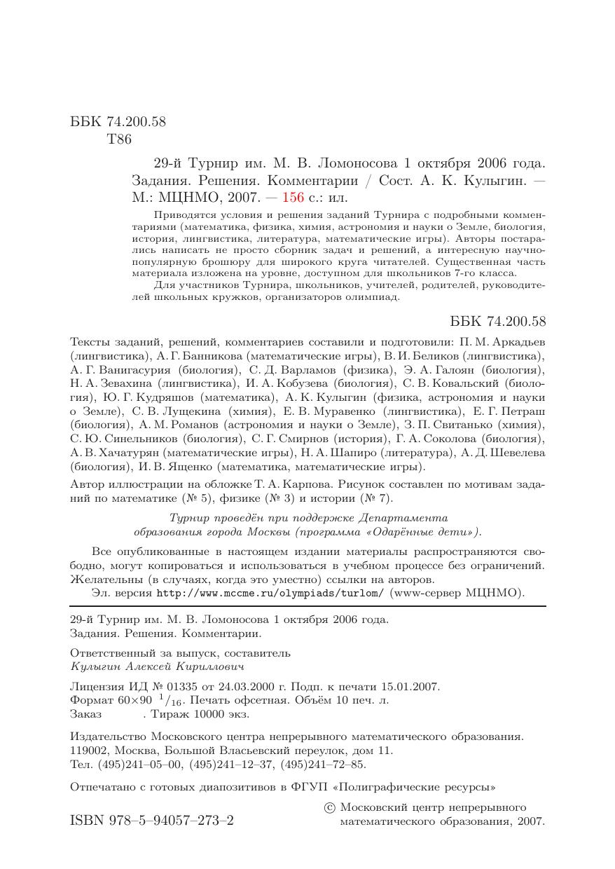 Приводятся условия и решения заданий Турнира с подробными комментариями (математика, физика, химия, астрономия и науки о Земле, биология, история, лингвистика, литература, математические игры). Авторы постарались написать не просто сборник задач и решений, а интересную научно-популярную брошюру для широкого круга читателей. Существенная часть материала изложена на уровне, доступном для школьников 7-го класса. Для участников Турнира, школьников, учителей, родителей, руководителей школьных кружков, организаторов олимпиад.