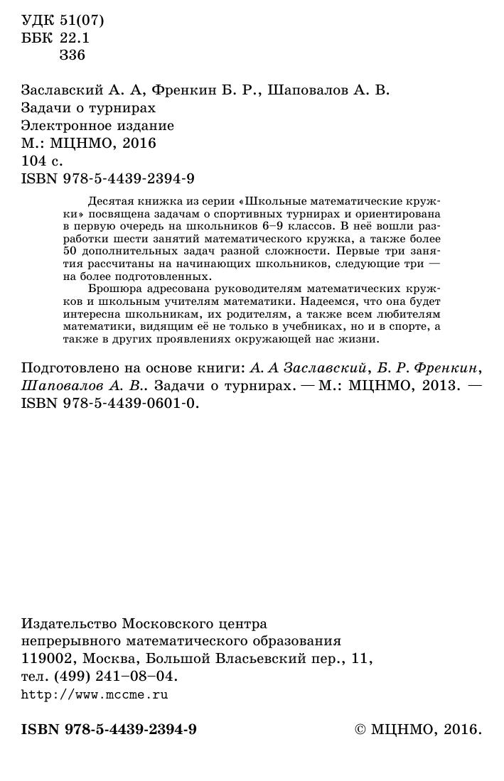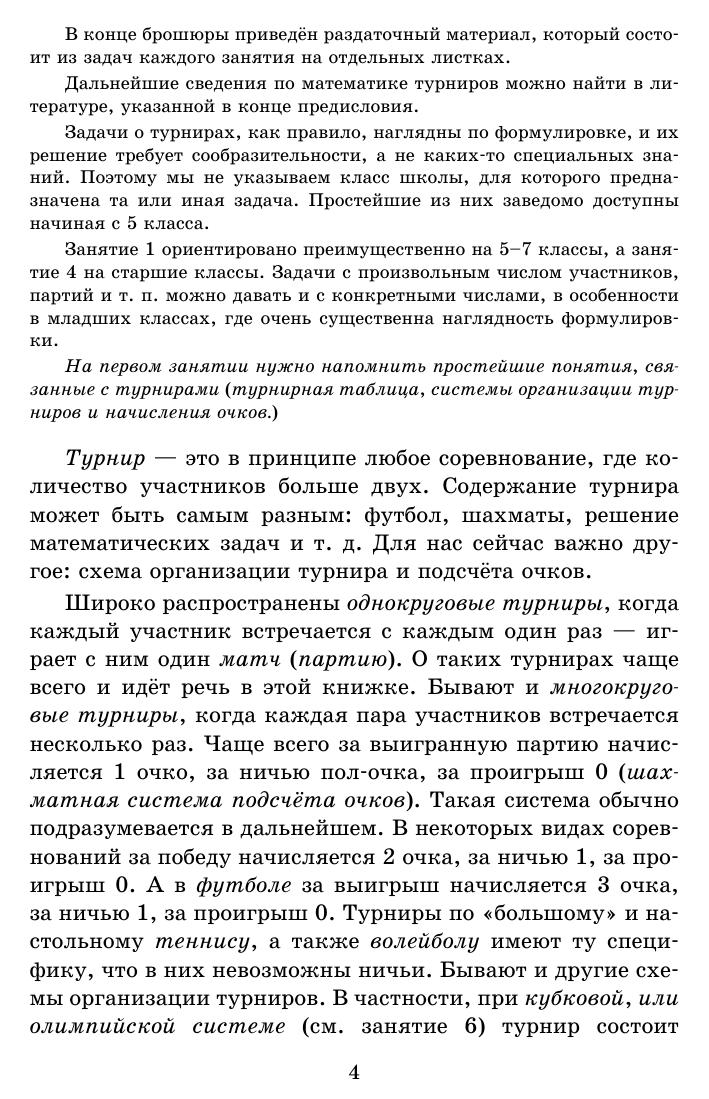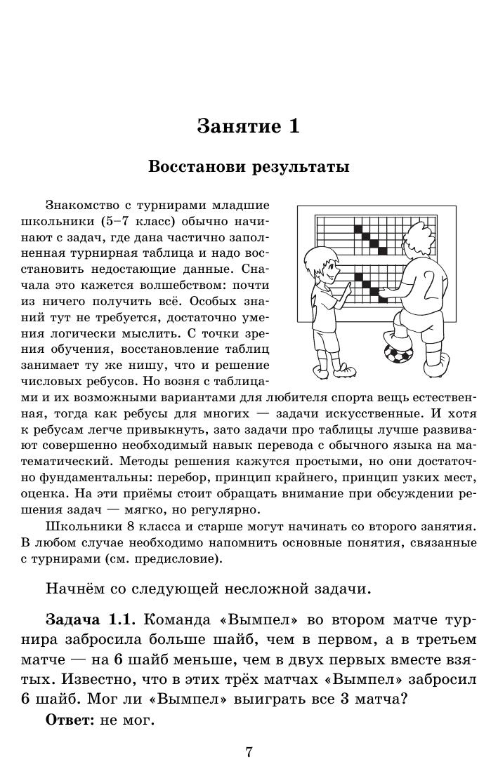 Десятая книжка из серии «Школьные математические кружки» посвящена задачам о спортивных турнирах и ориентирована в первую очередь на школьников 6–9 классов. В неё вошли разработки шести занятий математического кружка, а также более