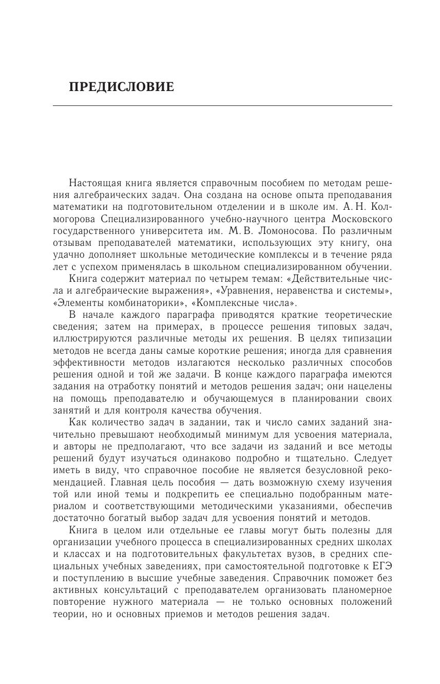 Книга создана на основе курса математики подготовительного отделения МГУ и содержит основные методы решения задач по алгебре. Изложение методов сопровождается необходимыми теоретическими сведениями и разбором примеров. По каждой теме приводятся задания и упражнения для ее более глубокого усвоения и закрепления. Для школьников старших классов и слушателей подготовительных отделений. Может использоваться для самостоятельной подготовки к ЕГЭ и вступительным экзаменам в вуз.