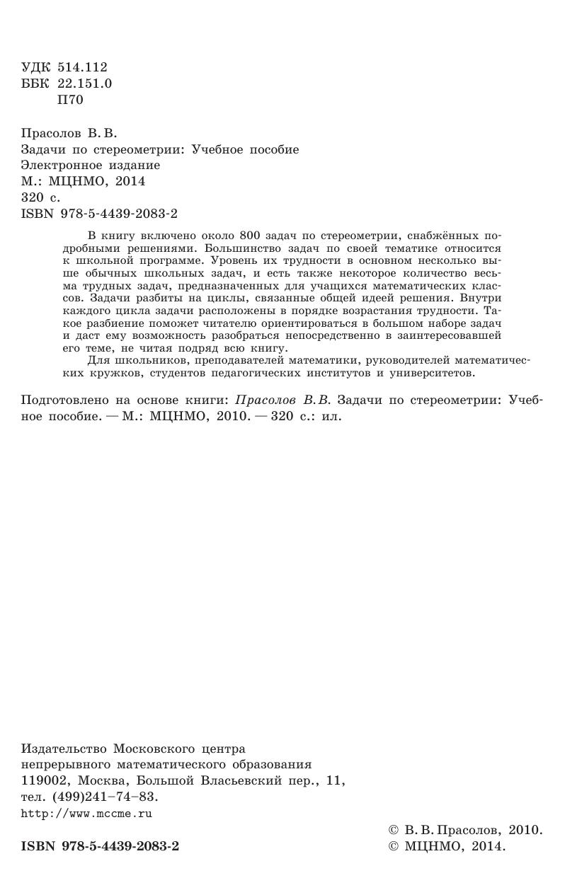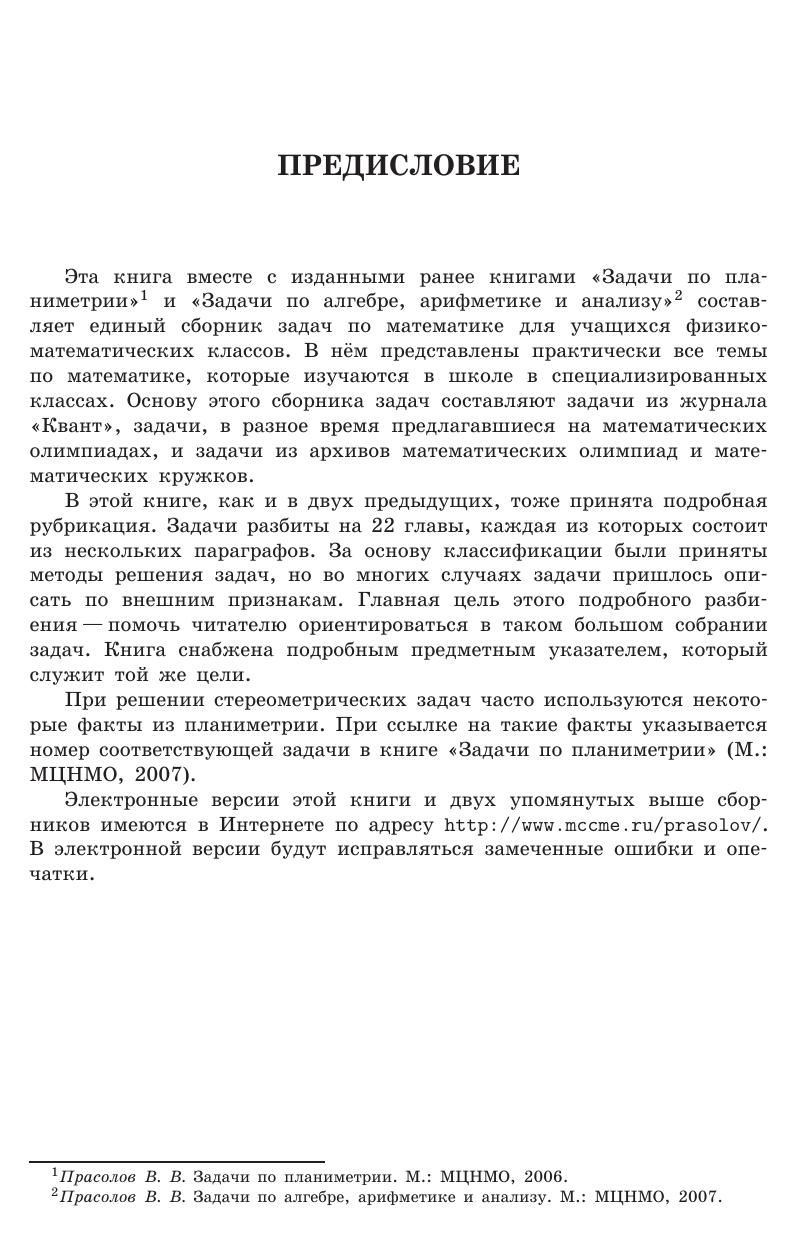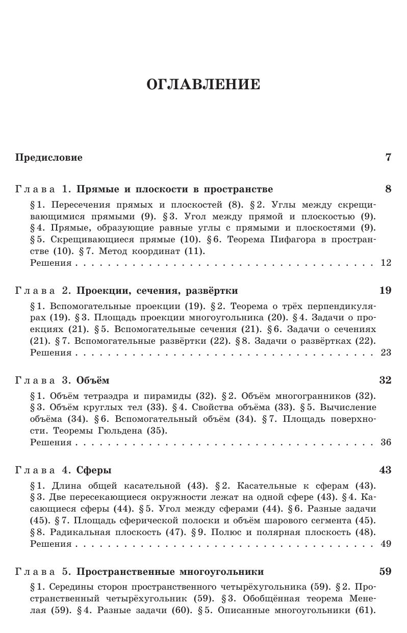 В книгу включено около 800 задач по стереометрии, снабжённых подробными решениями. Большинство задач по своей тематике относится к школьной программе. Уровень их трудности в основном несколько выше обычных школьных задач, и есть также некоторое количество весьма трудных задач, предназначенных для учащихся математических классов. Задачи разбиты на циклы, связанные общей идеей решения. Внутри каждого цикла задачи расположены в порядке возрастания трудности. Такое разбиение поможет читателю ориентироваться в большом наборе задач и даст ему возможность разобраться непосредственно в заинтересовавшей его теме, не читая подряд всю книгу. Для школьников, преподавателей математики, руководителей математических кружков, студентов педагогических институтов и университетов.