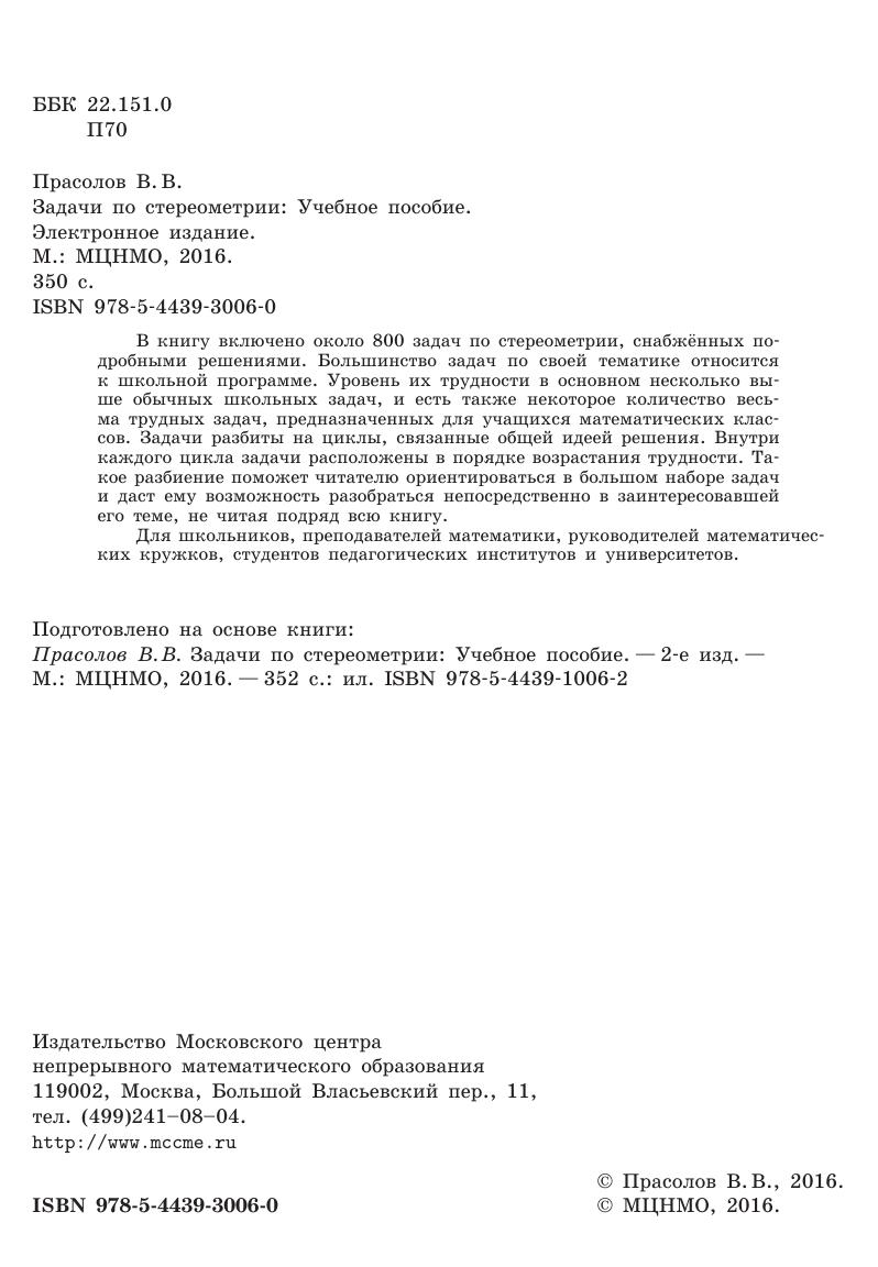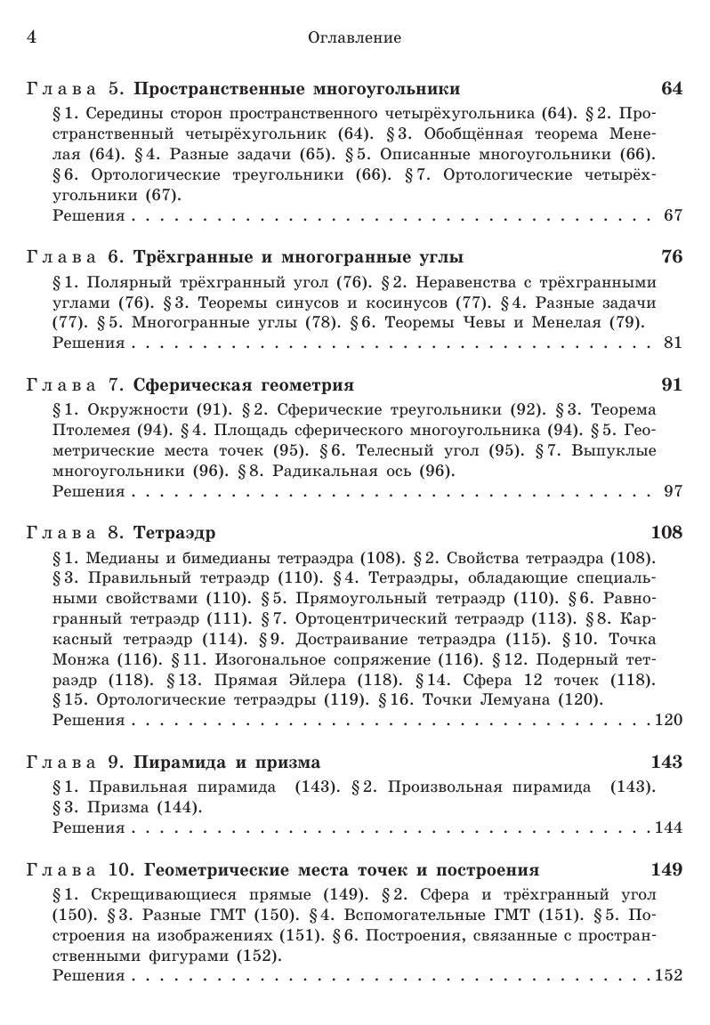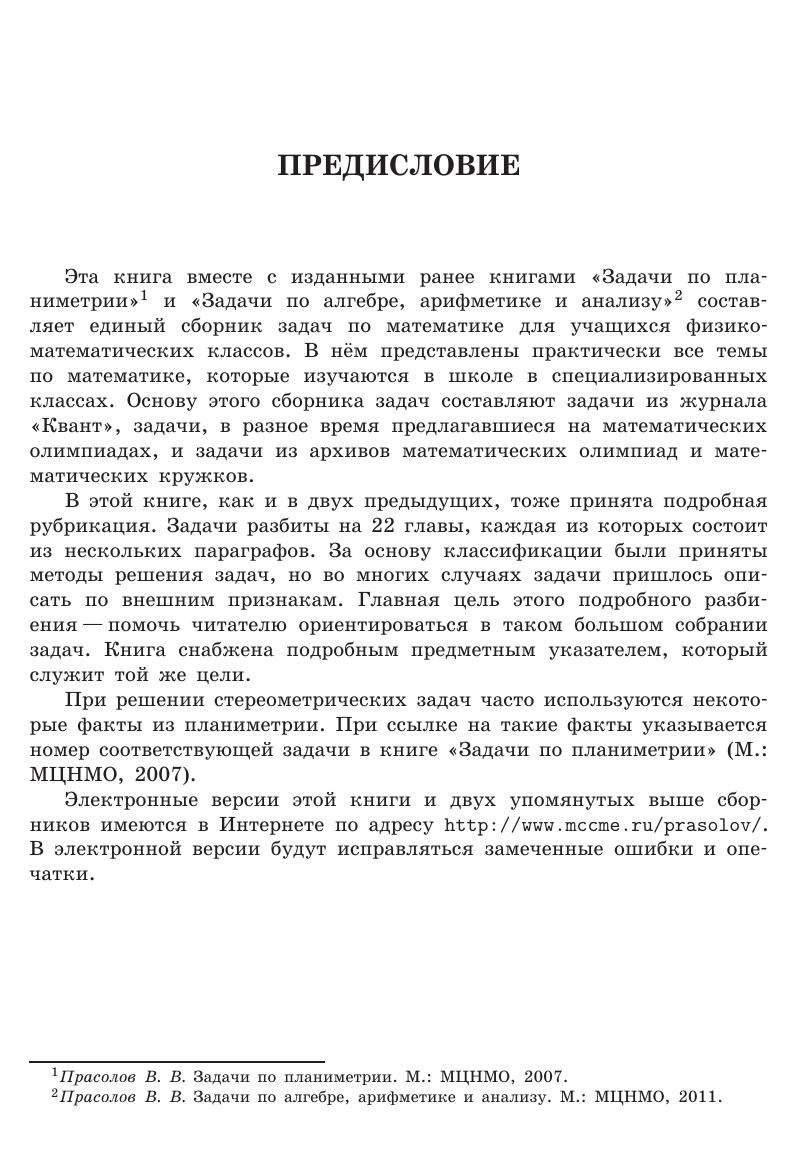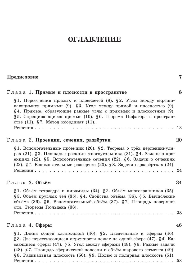 В книгу включено около 800 задач по стереометрии, снабжённых подробными решениями. Большинство задач по своей тематике относится к школьной программе. Уровень их трудности в основном несколько выше обычных школьных задач, и есть также некоторое количество весьма трудных задач, предназначенных для учащихся математических классов. Задачи разбиты на циклы, связанные общей идеей решения. Внутри каждого цикла задачи расположены в порядке возрастания трудности. Такое разбиение поможет читателю ориентироваться в большом наборе задач и даст ему возможность разобраться непосредственно в заинтересовавшей его теме, не читая подряд всю книгу. Для школьников, преподавателей математики, руководителей математических кружков, студентов педагогических институтов и университетов.