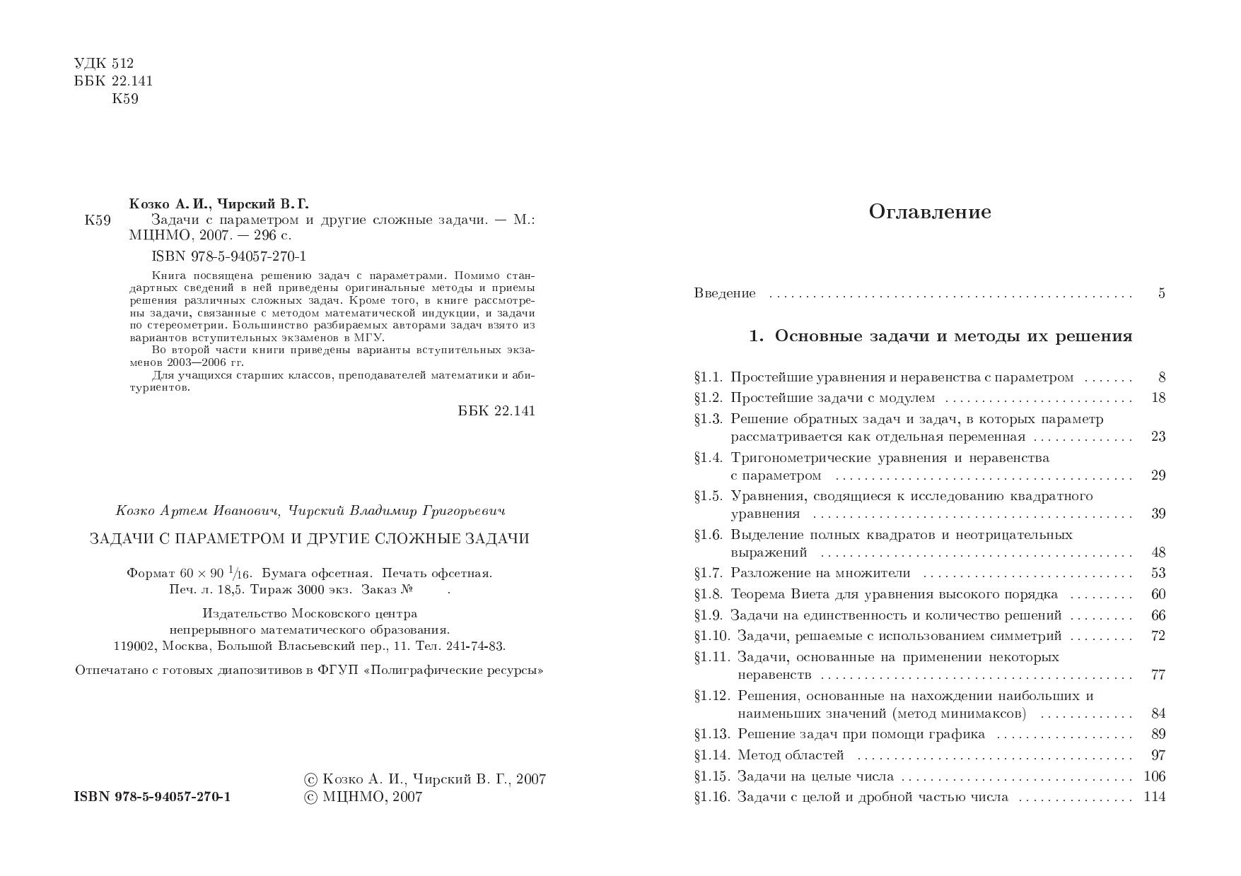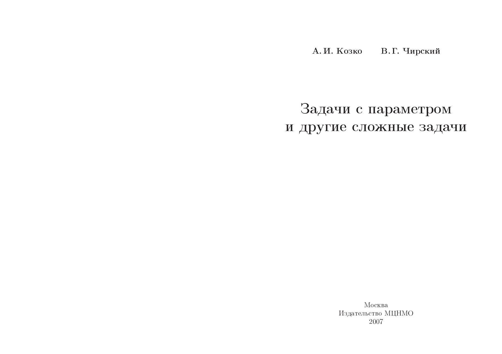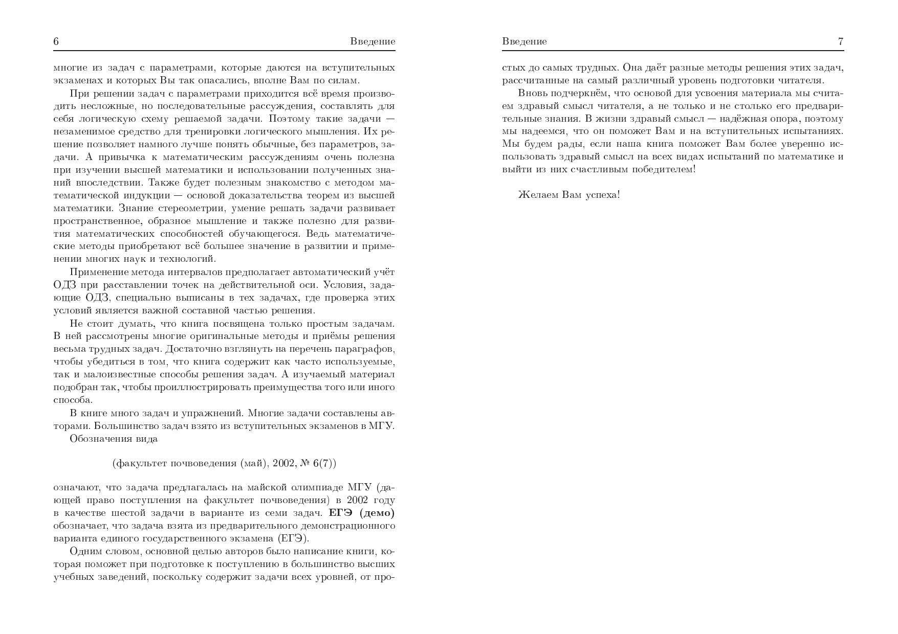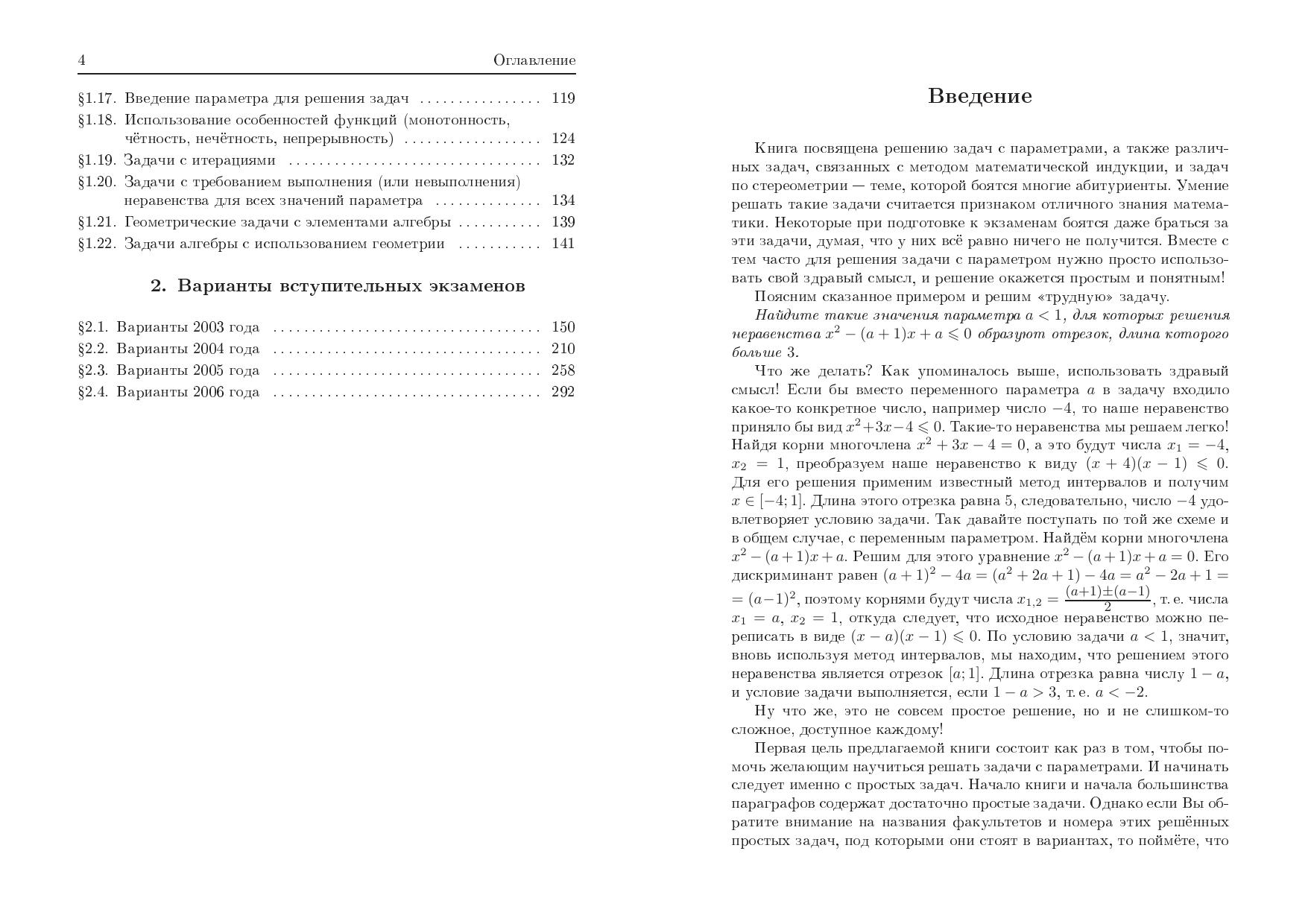 Книга посвящена решению задач с параметрами. Помимо стандартных сведений в ней приведены оригинальные методы и приемы решения различных сложных задач. Кроме того, в книге рассмотрены задачи, связанные с методом математической индукции, и задачи по стереометрии. Большинство разбираемых авторами задач взято из вариантов вступительных экзаменов в МГУ.Во второй части книги приведены варианты вступительных экзаменов 2003–2006 гг.Для учащихся старших классов, преподавателей математики и абитуриентов.