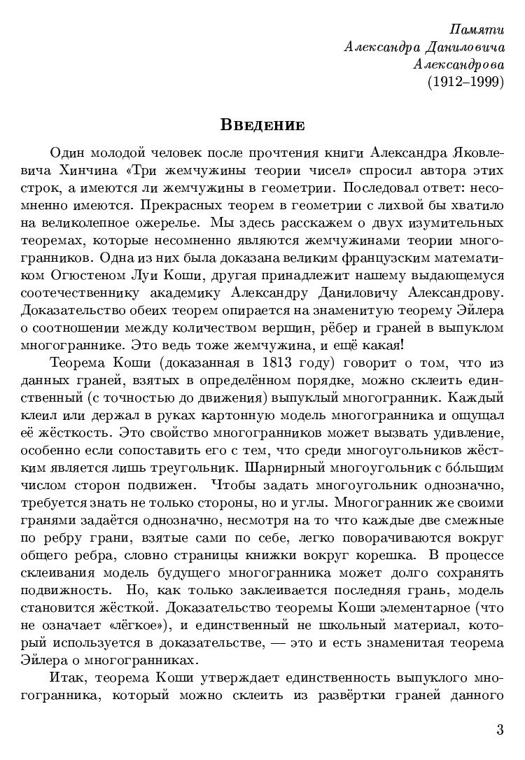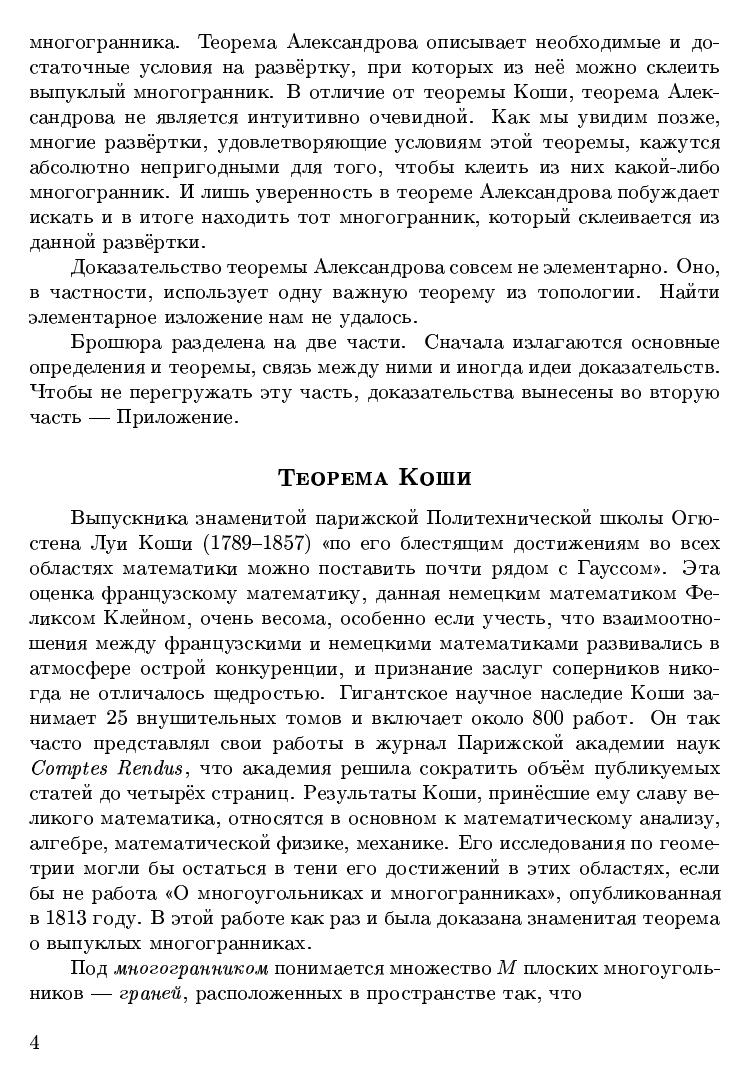 Текст брошюры представляет собой обработанные и дополненные записи лекции, прочитанной автором 2 октября 1999 года на Малом мехмате для школьников 9-11 классов.В брошюре, в частности, рассказывается об основных теоремах теории выпуклых многогранников. Это - теорема Коши о единственности выпуклого многогранника с заданными гранями и теорема Александрова о том, из каких развёрток можно склеить выпуклый многогранник. В основной части брошюры излагаются основные результаты и идеи их доказательства. В приложении содержатся подробные доказательства нескольких теорем о многогранниках, в том числе доказательство знаменитой теоремы Эйлера.