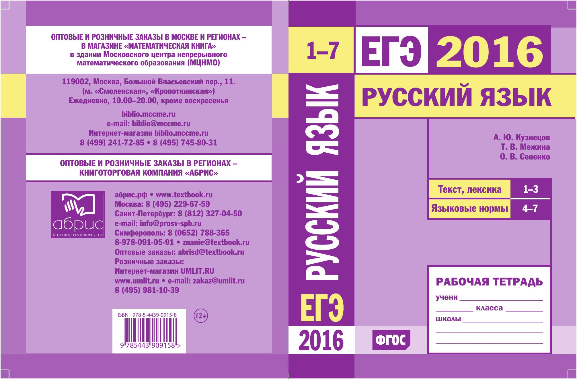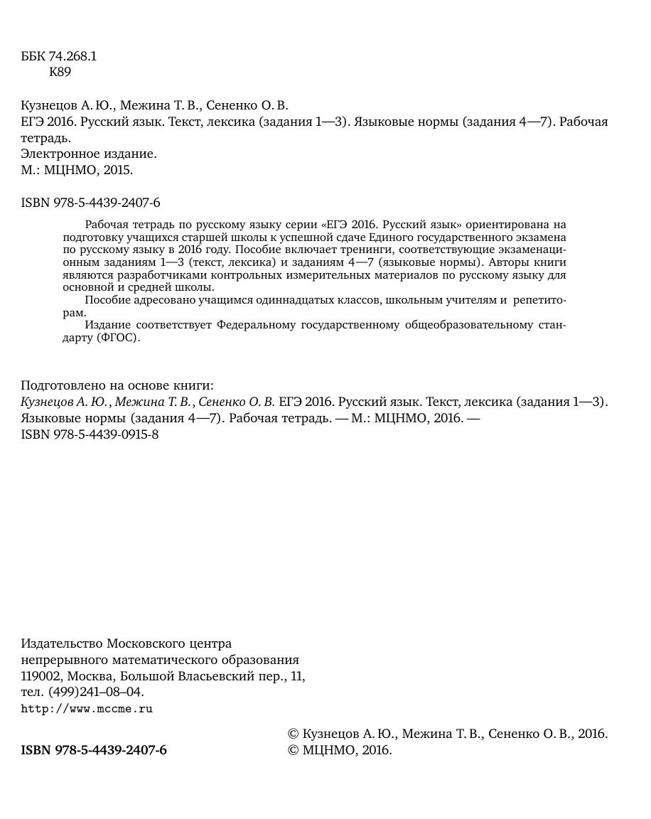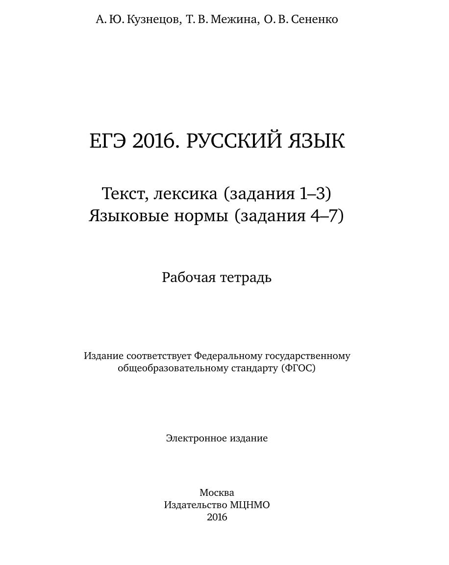 Рабочая тетрадь по русскому языку серии «ЕГЭ 2016. Русский язык» ориентирована на подготовку учащихся старшей школы к успешной сдаче Единого государственного экзамена по русскому языку в 2016 году. Пособие включает тренинги, соответствующие экзаменационным заданиям 1—3 (текст, лексика) и заданиям 4—7 (языковые нормы). Авторы книги являются разработчиками контрольных измерительных материалов по русскому языку для основной и средней школы. Пособие адресовано учащимся одиннадцатых классов, школьным учителям и репетиторам. Издание соответствует Федеральному государственному общеобразовательному стандарту (ФГОС).