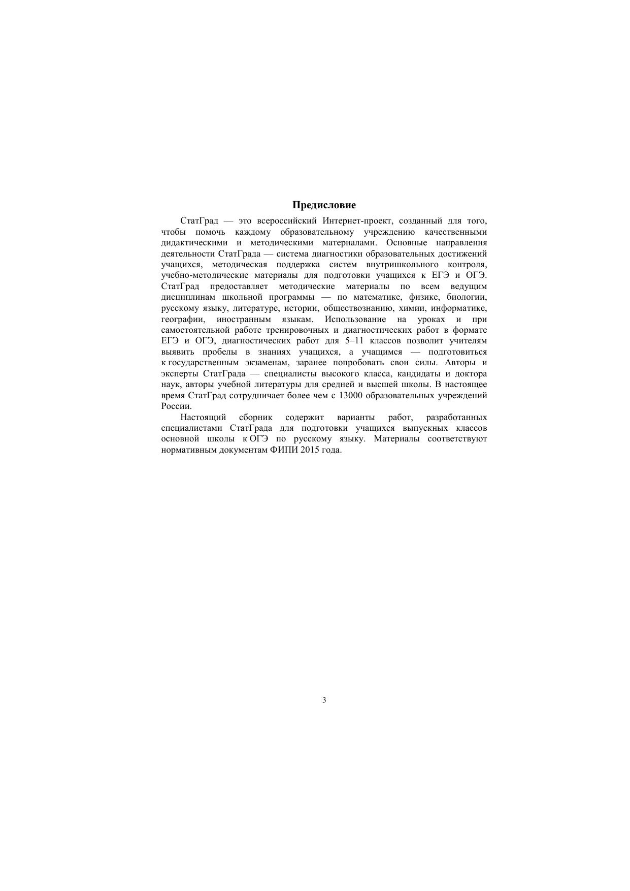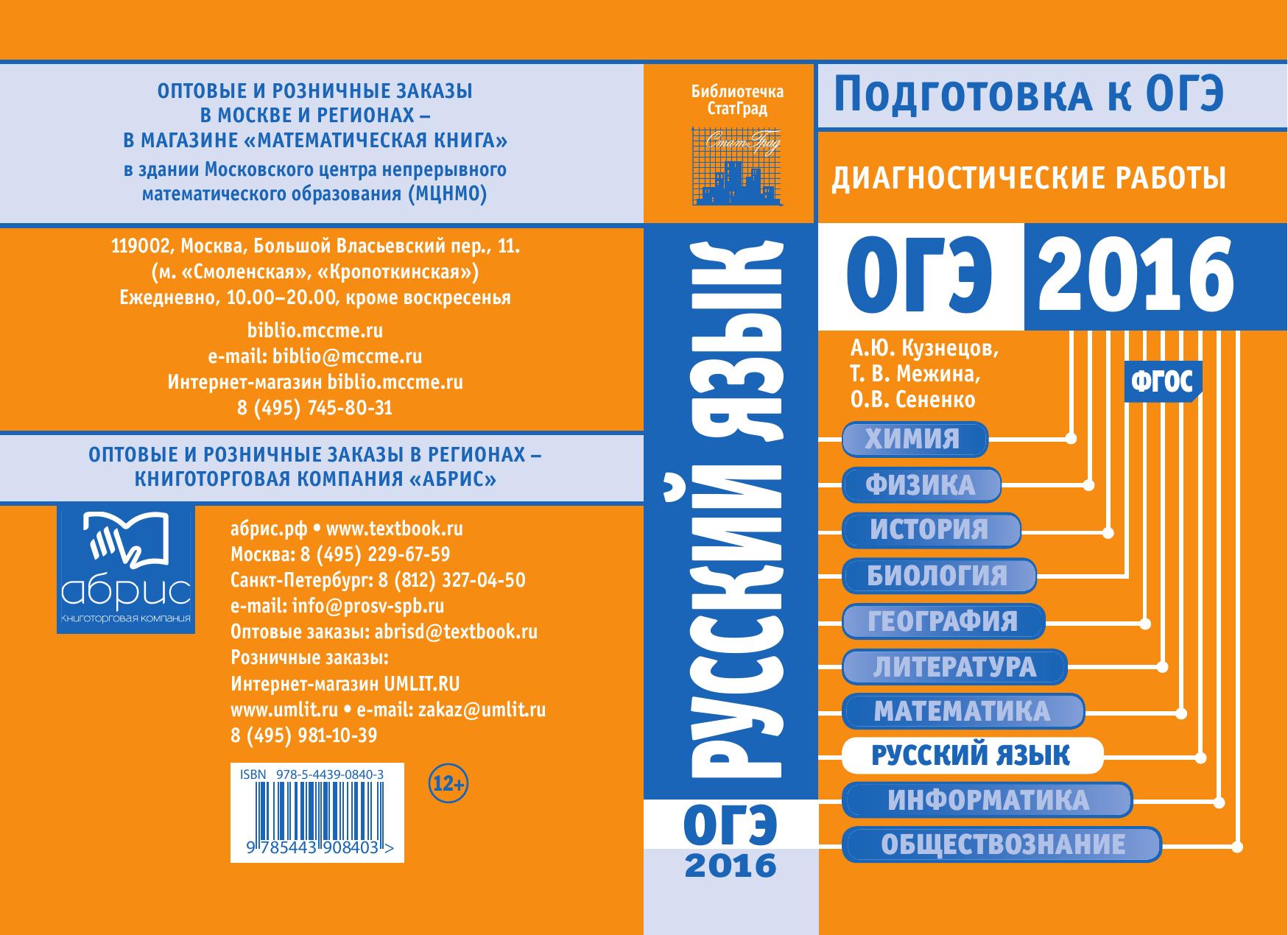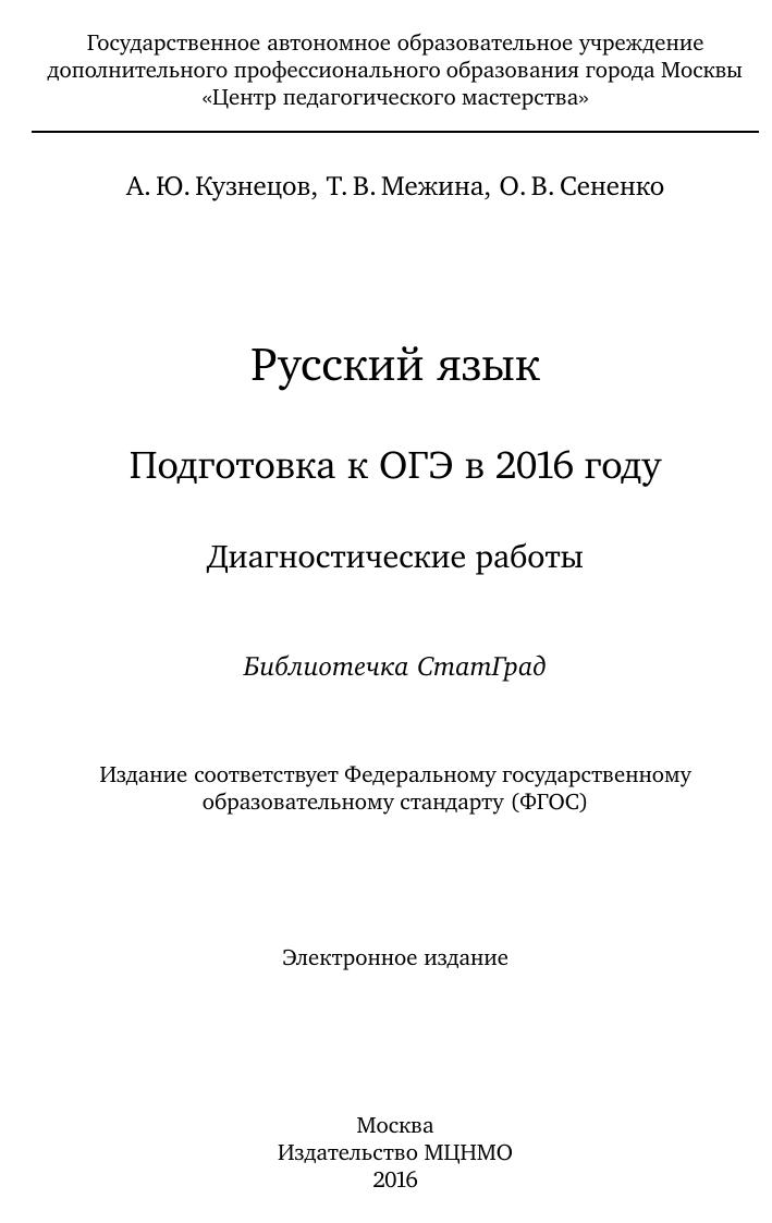 Данное пособие предназначено для отработки практических умений и навыков учащихся при подготовке к экзамену по русскому языку в 9 классе в форме ОГЭ. Оно содержит варианты диагностических работ по русскому языку, содержание которых соответствует контрольно- измерительным материалам, разработанным Федеральным институтом педагогических измерений для проведения государственной итоговой аттестации. В книгу входят также ответы к заданиям и критерии проверки и оценивания выполнения заданий с развёрнутым ответом. Авторы пособия являются разработчиками тренировочных и диагностических работ для системы СтатГрад (http://statgrad.org). Материалы книги рекомендованы учителям и методистам для выявления уровня и качества подготовки учащихся по предмету, определения степени их готовности к государственной итоговой аттестации. Издание соответствует Федеральному государственному образовательному стандарту (ФГОС).