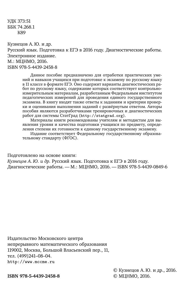 Данное пособие предназначено для отработки практических умений и навыков учащихся при подготовке к экзамену по русскому языку в 11 классе в формате ЕГЭ. Оно содержит варианты диагностических работ по русскому языку, содержание которых соответствует контрольно- измерительным материалам, разработанным Федеральным институтом педагогических измерений для проведения единого государственного экзамена. В книгу входят также ответы к заданиям и критерии проверки и оценивания выполнения заданий с развёрнутым ответом. Авторы пособия являются разработчиками тренировочных и диагностических работ для системы СтатГрад (http://statgrad.org). Материалы книги рекомендованы учителям и методистам для выявления уровня и качества подготовки учащихся по предмету, определения степени их готовности к единому государственному экзамену. Издание соответствует Федеральному государственному образовательному стандарту (ФГОС).