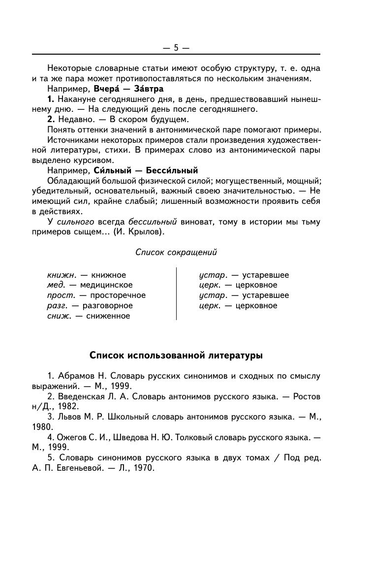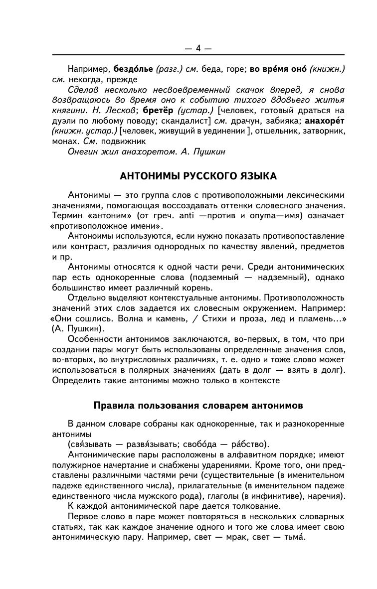 Словарь содержит около 50000 синонимов и 600 антонимических пар. В предлагаемом издании собраны наиболее употребительные слова, которые образуют синонимические ряды, в том числе устаревшие, просторечные и пр., и антонимические пары.