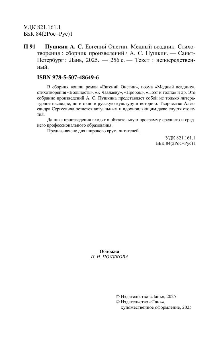 В сборник вошли роман «Евгений Онегин», поэма «Медный всадник», стихотворения «Вольность», «К Чаадаеву», «Пророк», «Поэт и толпа» и др. Это собрание произведений А. С. Пушкина представляет собой не только литературное наследие, но и окно в русскую культуру и историю. Творчество Александра Сергеевича остается актуальным и вдохновляющим даже спустя столетия. Данные произведения входят в обязательную программу среднего и среднего профессионального образования. Предназначено для широкого круга читателей.