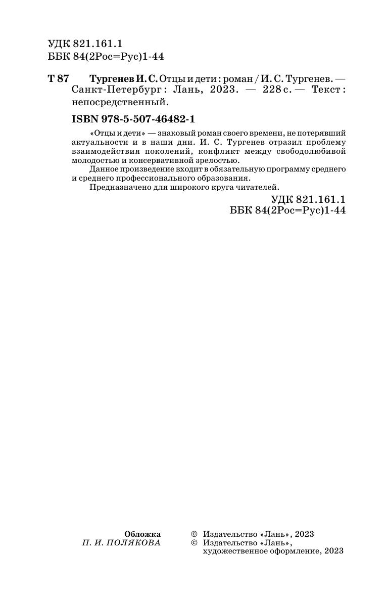 «Отцы и дети» — знаковый роман своего времени, не потерявший актуальности и в наши дни. И. С. Тургенев отразил проблему взаимодействия поколений, конфликт между свободолюбивой молодостью и консервативной зрелостью. Данное произведение входит в обязательную программу среднего и среднего профессионального образования. Предназначено для широкого круга читателей.