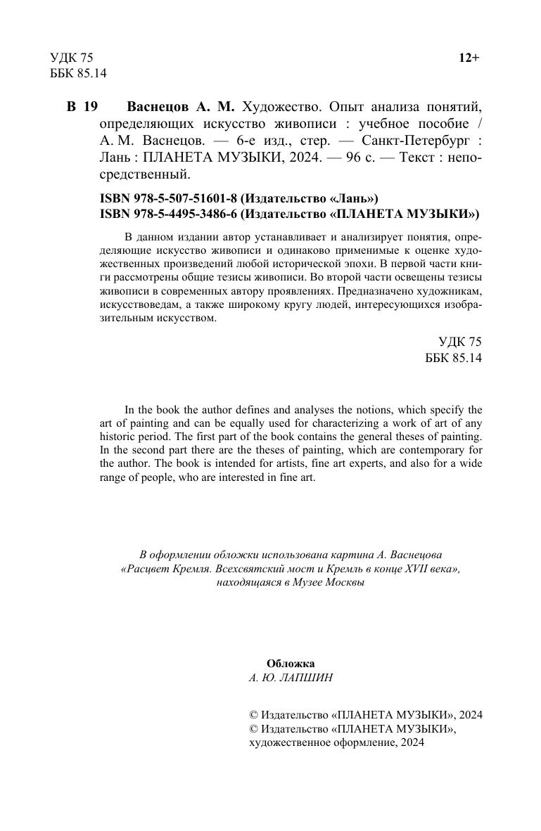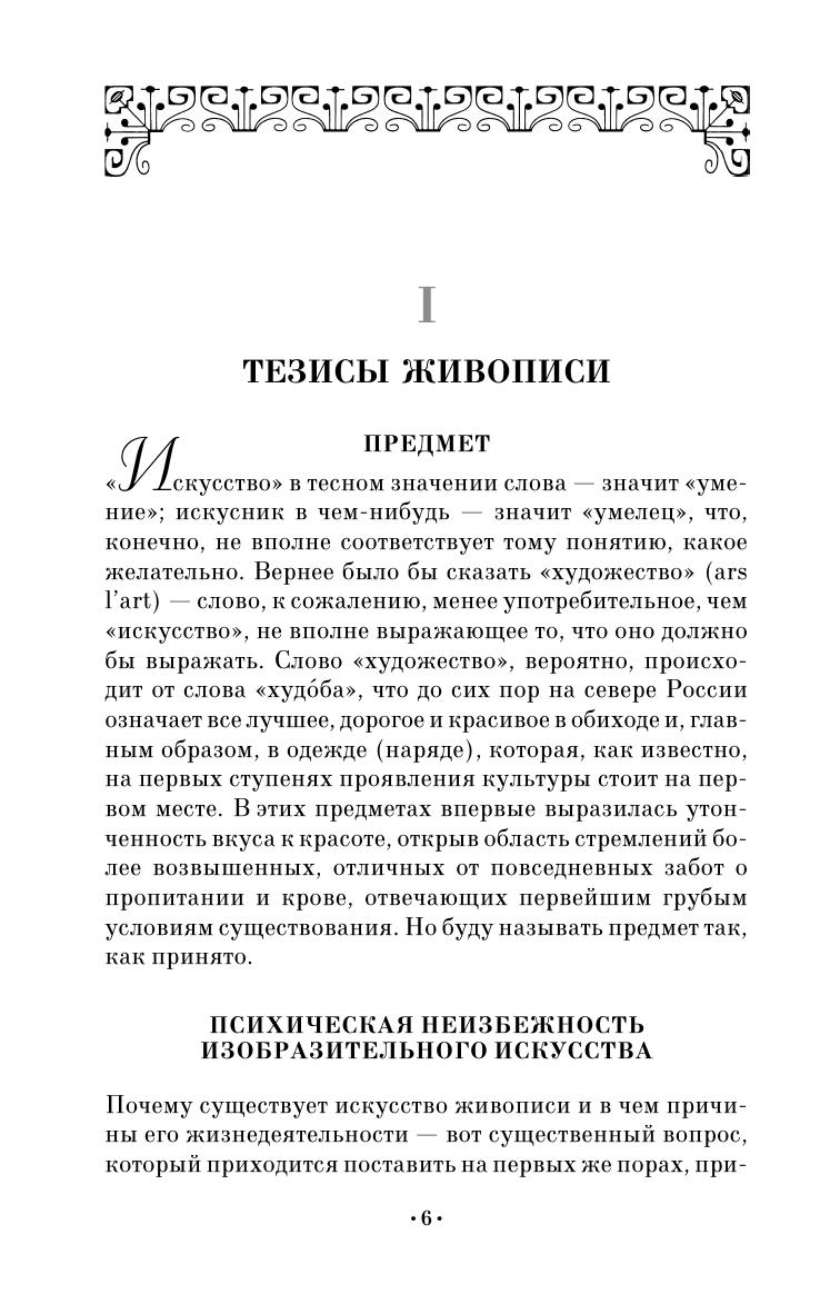 В данном издании автор устанавливает и анализирует понятия, определяющие искусство живописи и одинаково применимые к оценке художественных произведений любой исторической эпохи. В первой части книги рассмотрены общие тезисы живописи. Во второй части освещены тезисы живописи в современных автору проявлениях. Предназначено художникам, искусствоведам, а также широкому кругу людей, интересующихся изобразительным искусством. In the book the author defines and analyses the notions, which specify the art of painting and can be equally used for characterizing a work of art of any historic period. The first part of the book contains the general theses of painting. In the second part there are the theses of painting, which are contemporary for the author. The book is intended for artists, fine art experts, and also for a wide range of people, who are interested in fine art.
