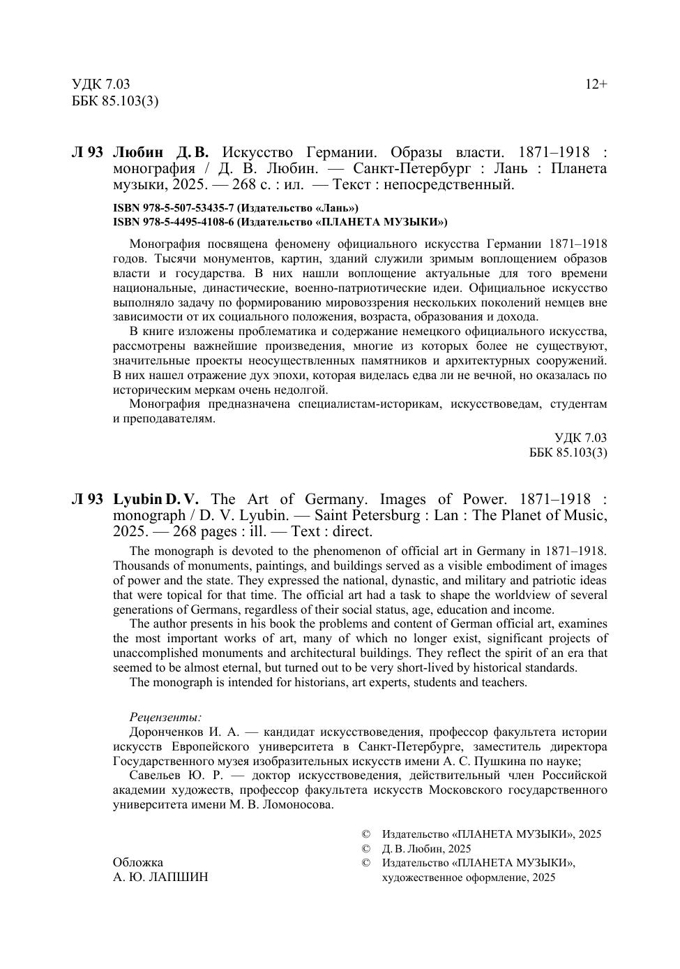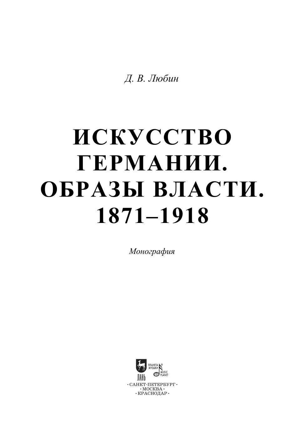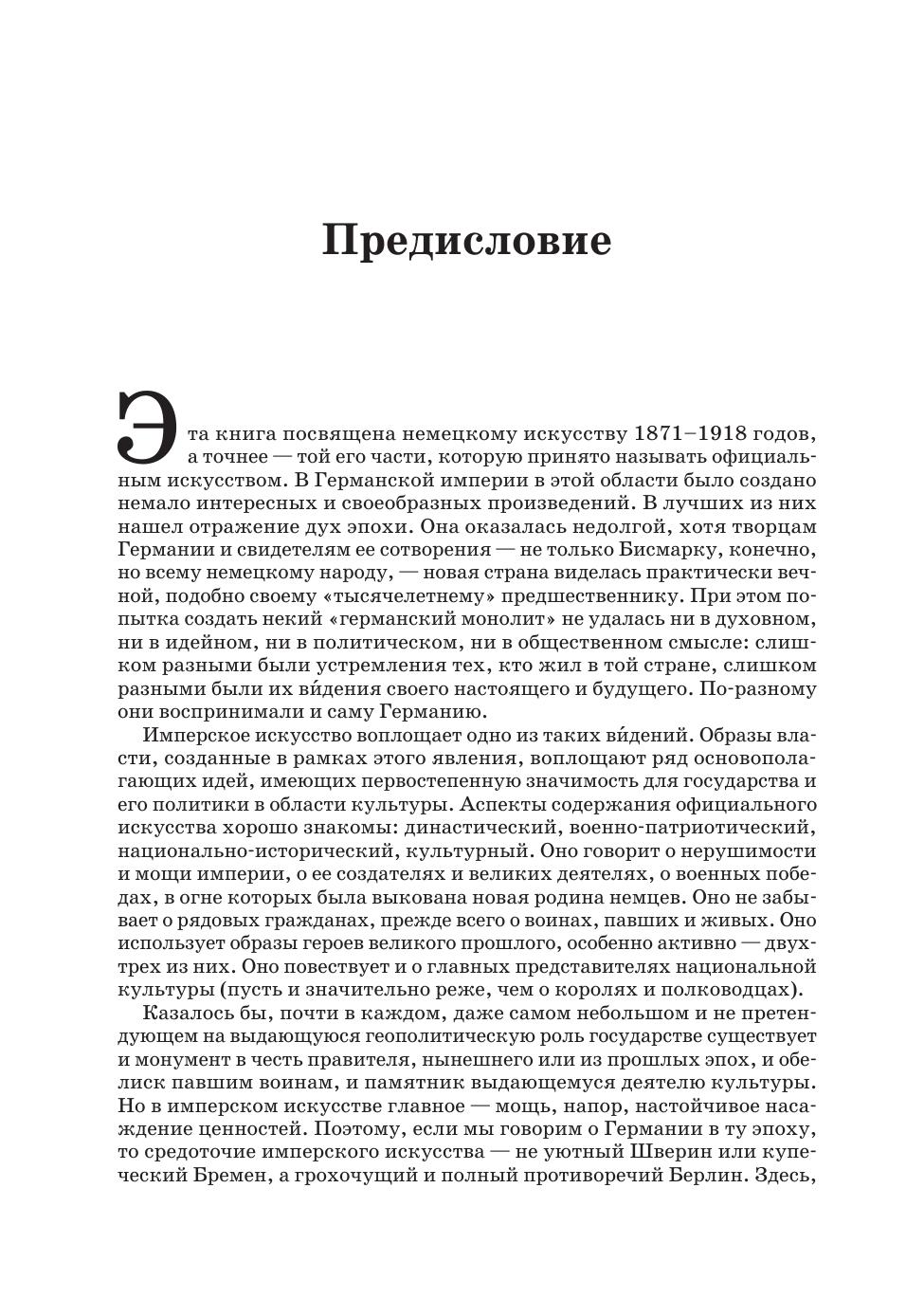 Монография посвящена феномену официального искусства Германии 1871–1918 годов. Тысячи монументов, картин, зданий служили зримым воплощением образов власти и государства. В них нашли воплощение актуальные для того времени национальные, династические, военно-патриотические идеи. Официальное искусство выполняло задачу по формированию мировоззрения нескольких поколений немцев вне зависимости от их социального положения, возраста, образования и дохода. В книге изложена проблематика и содержание немецкого официального искусства, рассмотрены важнейшие произведения, многие из которых более не существуют, значительные проекты неосуществленных памятников и архитектурных сооружений. В них нашел отражение дух эпохи, которая виделась едва ли не вечной, но оказалась по историческим меркам очень недолгой. Монография предназначена специалистам-историкам, искусствоведам, студентам и преподавателям. The monograph is devoted to the phenomenon of official art in Germany in 1871–1918. Thousands of monuments, paintings, and buildings served as a visible embodiment of images of power and the state. They expressed the national, dynastic, and military and patriotic ideas that were topical for that time. The official art had a task to shape the worldview of several generations of Germans, regardless of their social status, age, education and income. The author presents in his book the problems and content of German official art, examines the most important works of art, many of which no longer exist, significant projects of unaccomplished monuments and architectural buildings. They reflect the spirit of an era that seemed to be almost eternal, but turned out to be very short-lived by historical standards. The monograph is intended for historians, art experts, students and teachers.
