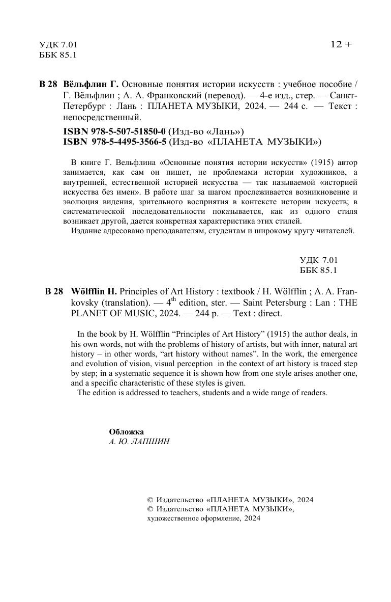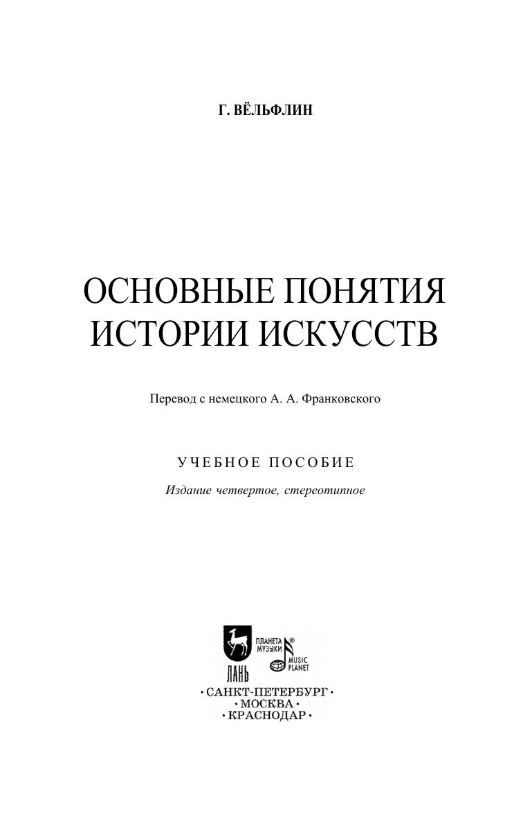 В книге Г. Вельфлина «Основные понятия истории искусств» (1915) автор занимается, как сам он пишет, не проблемами истории художников, а внутренней, естественной историей искусства – так называемой «историей искусства без имен». В работе шаг за шагом прослеживается возникновение и эволюция видения, зрительного восприятия в контексте истории искусств, в систематической последовательности показывается, как из одного стиля возникает другой, дается конкретная характеристика этих стилей. Издание адресовано преподавателям, студентам и широкому кругу читателей. In the book by H. Wölfflin “Principles of Art History” (1915) the author deals, in his own words, not with the problems of history of artists, but with inner, natural art history – in other words, “art history without names”. In the work, the emergence and evolution of vision, visual perception in the context of art history is traced step by step, in a systematic sequence it is shown how from one style arises another one, and a specific characteristic of these styles is given. The edition is addressed to teachers, students and a wide range of readers.