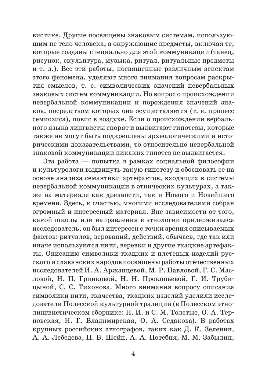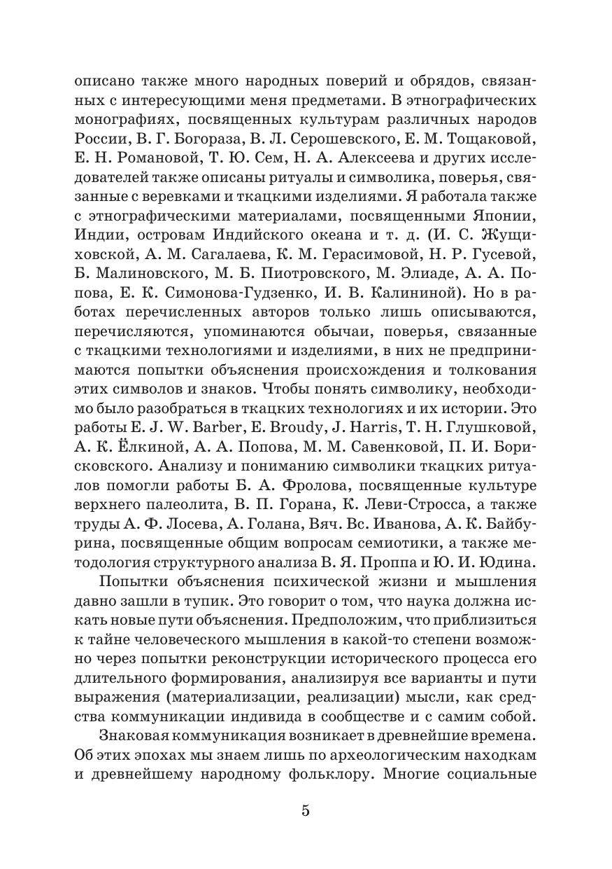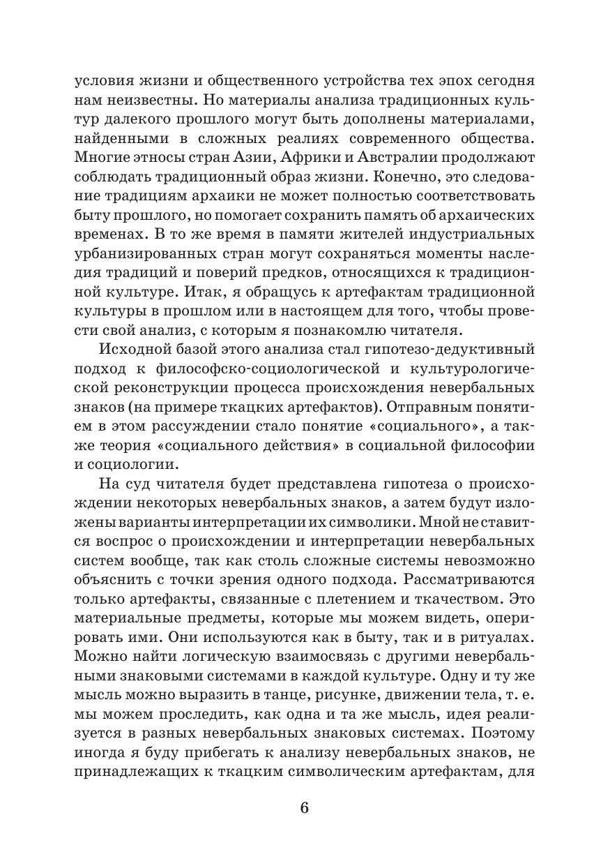 В книге высказывается гипотеза о происхождении невербальной коммуникации, использующей знаковые символы. Автор излагает материал на примере ткацких артефактов, которые используются в качестве символических знаков. В результате анализа обширного этнографического материала, связанного с ткачеством, были выделены и классифицированы символические значения веревки и нити, которые совпали по своему значению с функциями, выполняемыми ими в обыденной жизни и трудовых технологиях. Понимание тайны происхождения невербальных знаков и их символики возможно в кросс-культурных исследованиях. Книга рассчитана на читателей, интересующихся историей и философией культуры. The book contains a hypothesis about the origins of non-verbal communication using the sign symbols. The author presents the material with the example of weaving artifacts, which are used as symbolic signs. As a result of the analysis of extensive ethnographic material related to weaving, the symbolic meanings of rope and thread were identified and classified, which coincided by their meaining with their functions in everyday life and labor technologies. Understanding the mystery of the origin of non-verbal signs and their symbolism is possible in cross-cultural studies. The book is intended for readers interested in history and philosophy of culture.