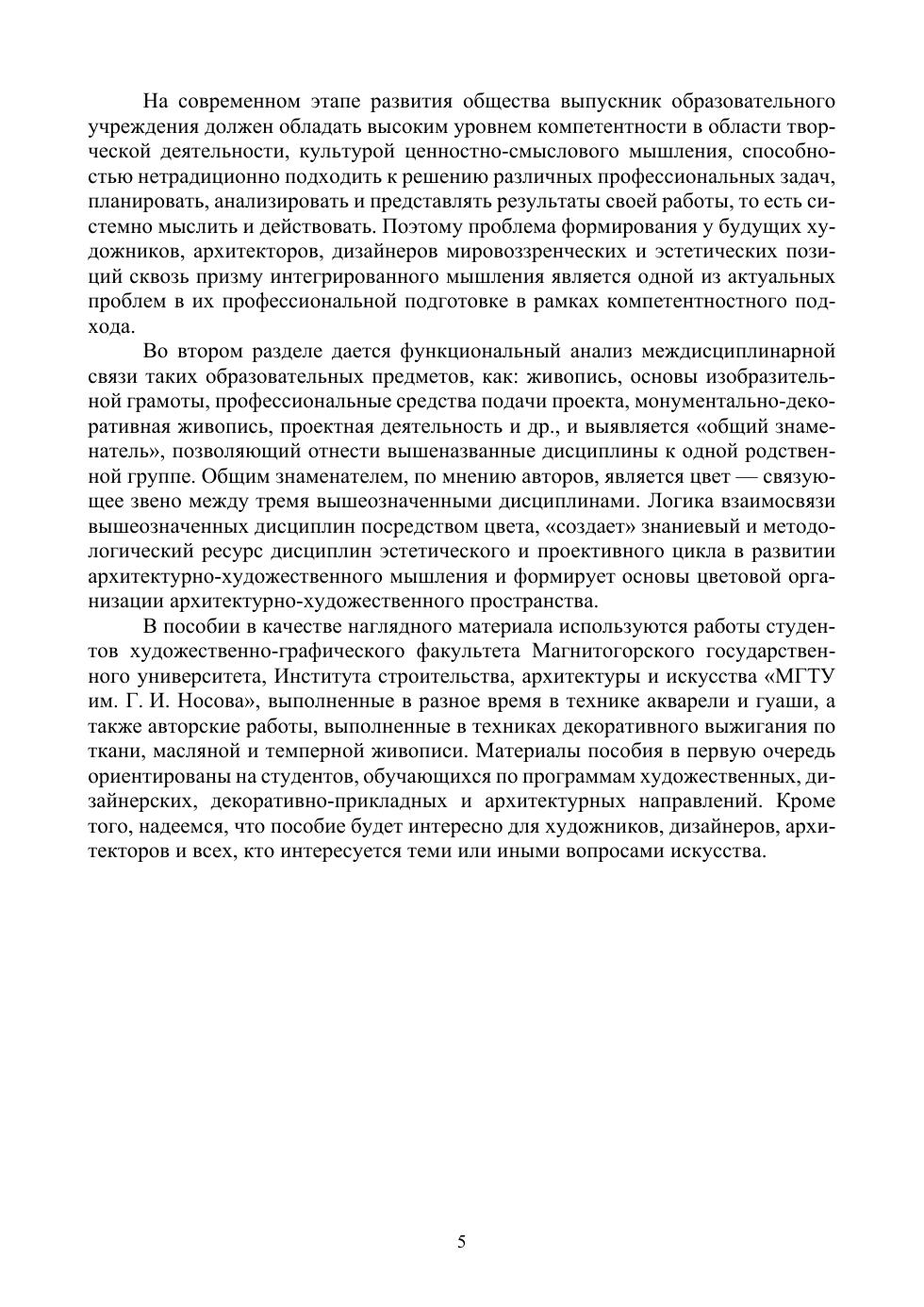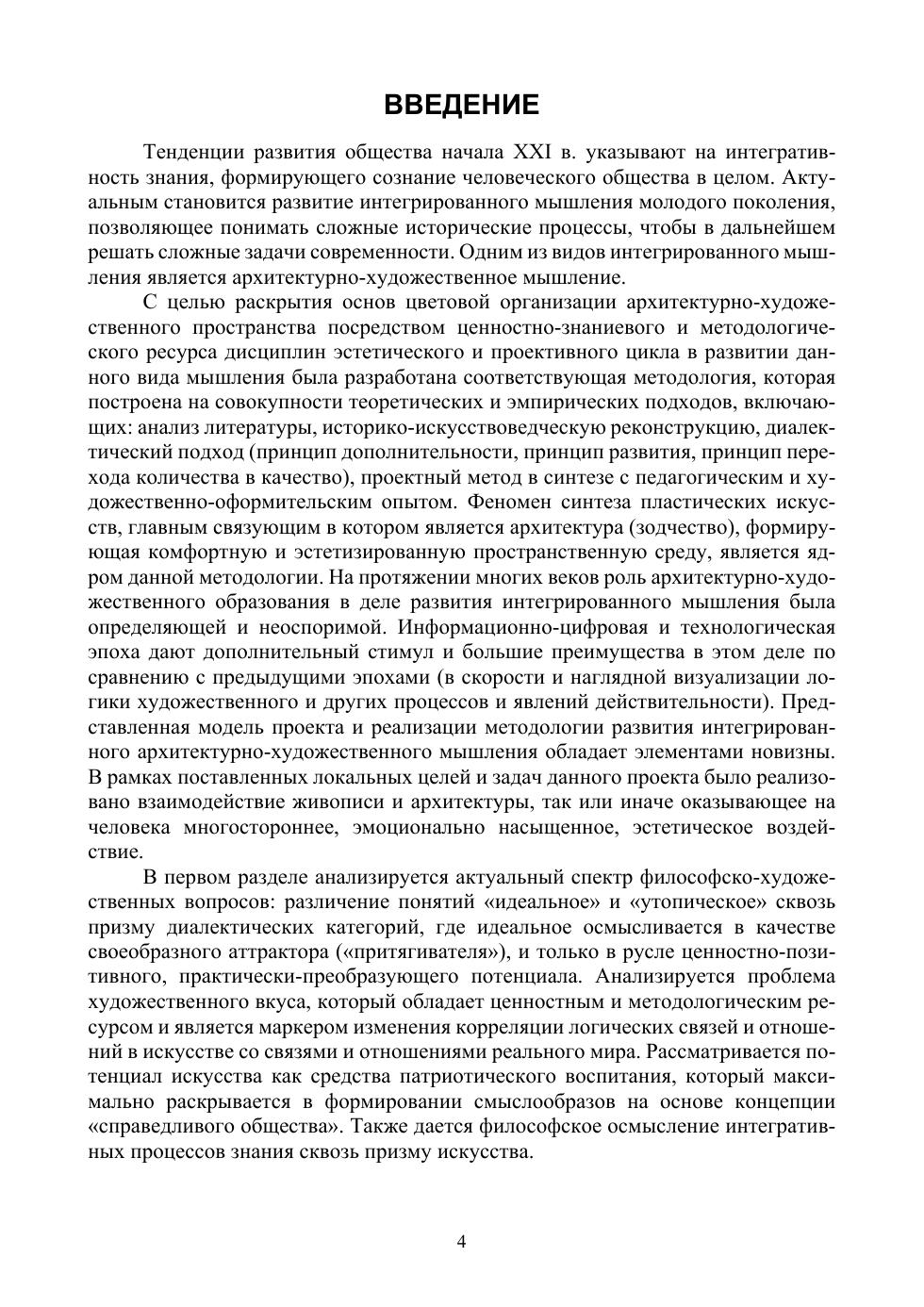Актуальность данного учебного пособия обусловлена ходом активной трансформации всей современной цивилизации. Так как архитектурно-художественное пространство способствуют формированию эстетического сознания общества, то сущностно важным является реализация знаниевого, ценностного и методологического ресурса дисциплин эстетического и проективного цикла при подготовке специалистов архитектурно-художественных направлений. Данное пособие как раз и посвящено анализу философско-художественных аспектов искусства, выявлению потенциала синтеза искусств и культурного прогресса, обнаружению межпредметной связи дисциплин колористического цикла, а также вопросам развития творческих способностей в системе архитектурно-художественного образования. Соответствует современным требованиям Федерального государственного образовательного стандарта среднего профессионального образования и профессиональным квалификационным требованиям. Материалы пособия ориентированы на студентов профессиональных образовательных организаций, обучающихся по художественным, дизайнерским, декоративно-прикладным и архитектурным направлениям подготовки. Кроме того, оно будет интересно уже работающим художникам, дизайнерам, архитекторам и всем, кто интересуется вопросами искусства.