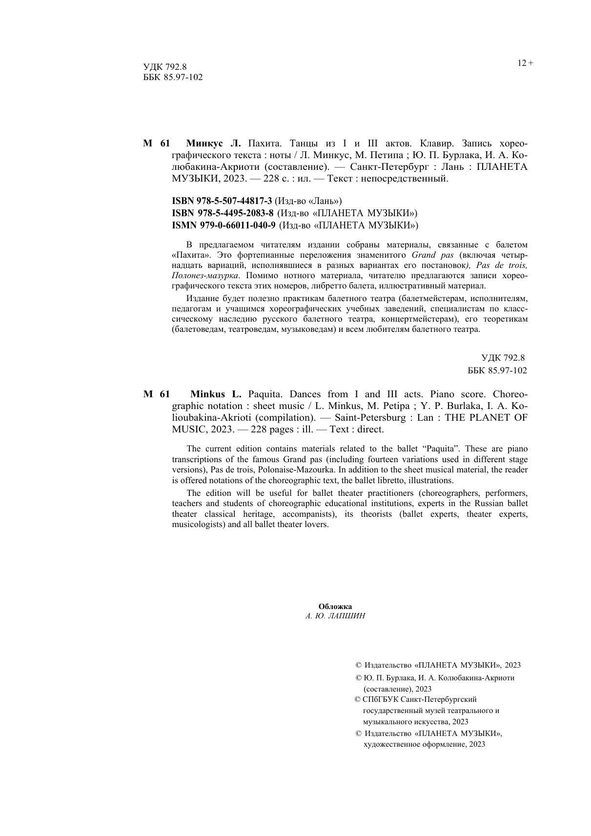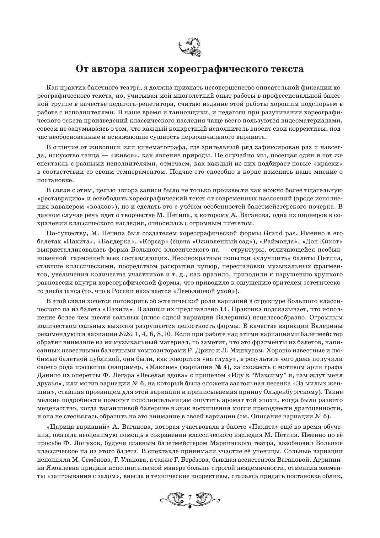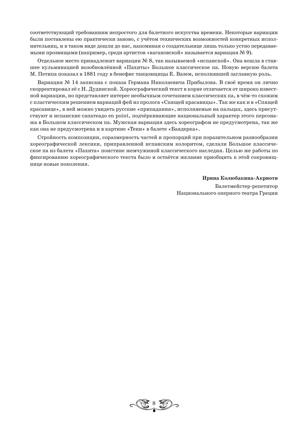 В предлагаемом читателям издании собраны материалы, связанные с балетом «Пахита». Это фортепианные переложения знаменитого Grand pas (включая четырнадцать вариаций, исполнявшиеся в разных вариантах его постановок), Pas de trois, Полонез-мазурка. Помимо нотного материала, читателю предлагаются записи хореографического текста этих номеров, либретто балета, иллюстративный материал. Издание будет полезно практикам балетного театра (балетмейстерам, исполнителям, педагогам и учащимся хореографических учебных заведений, специалистам по классическому наследию русского балетного театра, концертмейстерам), его теоретикам (балетоведам, театроведам, музыковедам) и всем любителям балетного театра. The сurrent edition contains materials related to the ballet “Paquita”. These are piano transcriptions of the famous Grand pas (including fourteen variations used in different stage versions), Pas de trois, Polonaise-Mazourka. In addition to the sheet musical material, the reader is offered notations of the choreographic text, the ballet libretto, illustrations. The edition will be useful for ballet theater practitioners (choreographers, performers, teachers and students of choreographic educational institutions, experts in the Russian ballet theater classical heritage, accompanists), its theorists (ballet experts, theater experts, musicologists) and all ballet theater lovers.