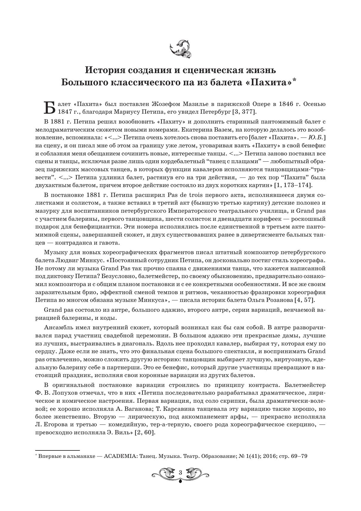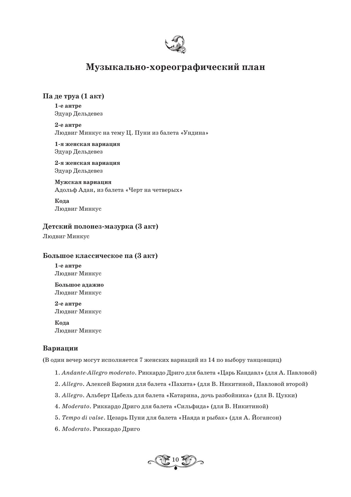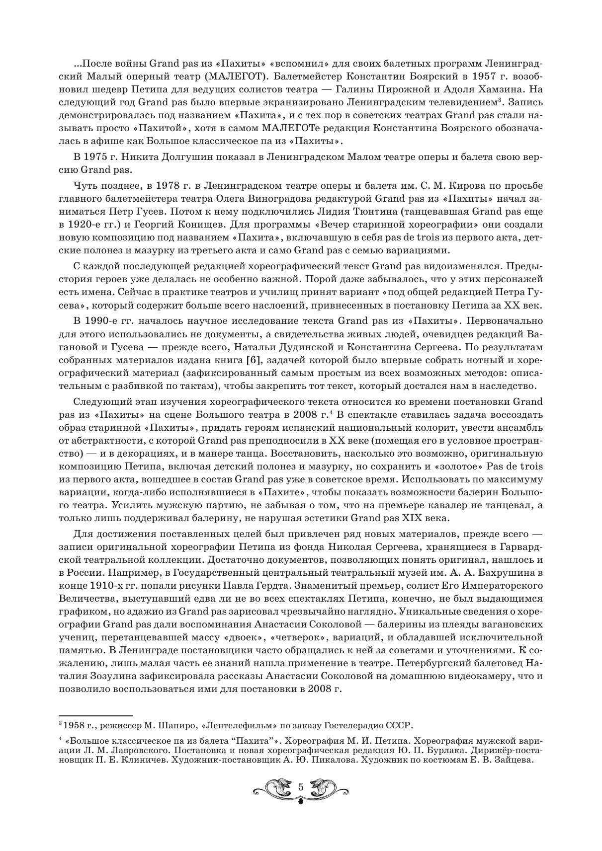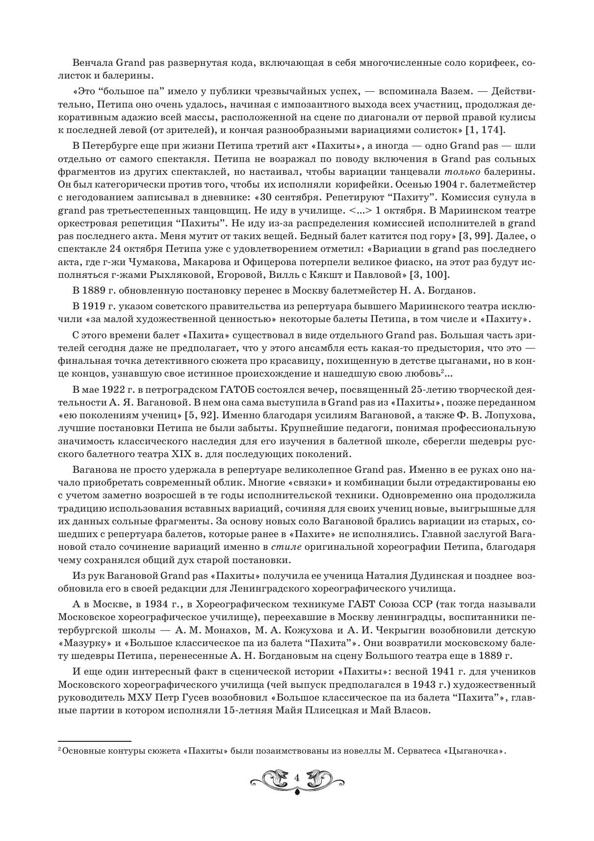 В предлагаемом читателям издании собраны материалы, связанные с балетом «Пахита». Это фортепианные переложения знаменитого Grand pas (включая четырнадцать вариаций, исполнявшиеся в разных вариантах его постановок), Pas de trois, Полонез-мазурка. Помимо нотного материала, читателю предлагаются записи хореографического текста этих номеров, либретто балета, иллюстративный материал. Издание будет полезно практикам балетного театра (балетмейстерам, исполнителям, педагогам и учащимся хореографических учебных заведений, специалистам по классическому наследию русского балетного театра, концертмейстерам), его теоретикам (балетоведам, театроведам, музыковедам) и всем любителям балетного театра. The сurrent edition contains materials related to the ballet “Paquita”. These are piano transcriptions of the famous Grand pas (including fourteen variations used in different stage versions), Pas de trois, Polonaise-Mazourka. In addition to the sheet musical material, the reader is offered notations of the choreographic text, the ballet libretto, illustrations. The edition will be useful for ballet theater practitioners (choreographers, performers, teachers and students of choreographic educational institutions, experts in the Russian ballet theater classical heritage, accompanists), its theorists (ballet experts, theater experts, musicologists) and all ballet theater lovers.