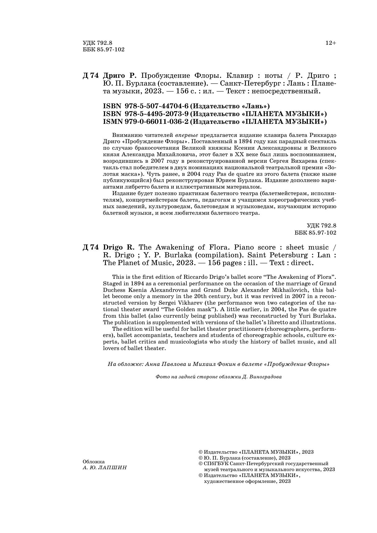 Вниманию читателей впервые предлагается издание клавира балета Риккардо Дриго «Пробуждение Флоры». Поставленный в 1894 году как парадный спектакль по случаю бракосочетания Великой княжны Ксении Александровны и Великого князя Александра Михайловича, этот балет в XX веке был лишь воспоминанием, возродившись в 2007 году в реконструированной версии Сергея Вихарева (спектакль стал победителем в двух номинациях национальной театральной премии «Золотая маска»). Чуть ранее, в 2004 году Pas de quatre из этого балета (также ныне публикующийся) был реконструирован Юрием Бурлака. Издание дополнено вариантами либретто балета и иллюстративным материалом. Издание будет полезно практикам балетного театра (балетмейстерам, исполнителям), концертмейстерам балета, педагогам и учащимся хореографических учебных заведений, культуроведам, балетоведам и музыковедам, изучающим историю балетной музыки, и всем любителями балетного театра. This is the first edition of Riccardo Drigo’s ballet score “The Awakening of Flora”. Staged in 1894 as a ceremonial performance on the occasion of the marriage of Grand Duchess Ksenia Alexandrovna and Grand Duke Alexander Mikhailovich, this ballet become only a memory in the 20th century, but it was revived in 2007 in a reconstructed version by Sergei Vikharev (the performance won two categories of the national theater award “The Golden mask”). A little earlier, in 2004, the Pas de quatre from this ballet (also currently being published) was reconstructed by Yuri Burlaka. The publication is supplemented with versions of the ballet’s libretto and illustrations. The edition will be useful for ballet theater practitioners (choreographers, performers), ballet accompanists, teachers and students of choreographic schools, culture experts, ballet critics and musicologists who study the history of ballet music, and all lovers of ballet theater.