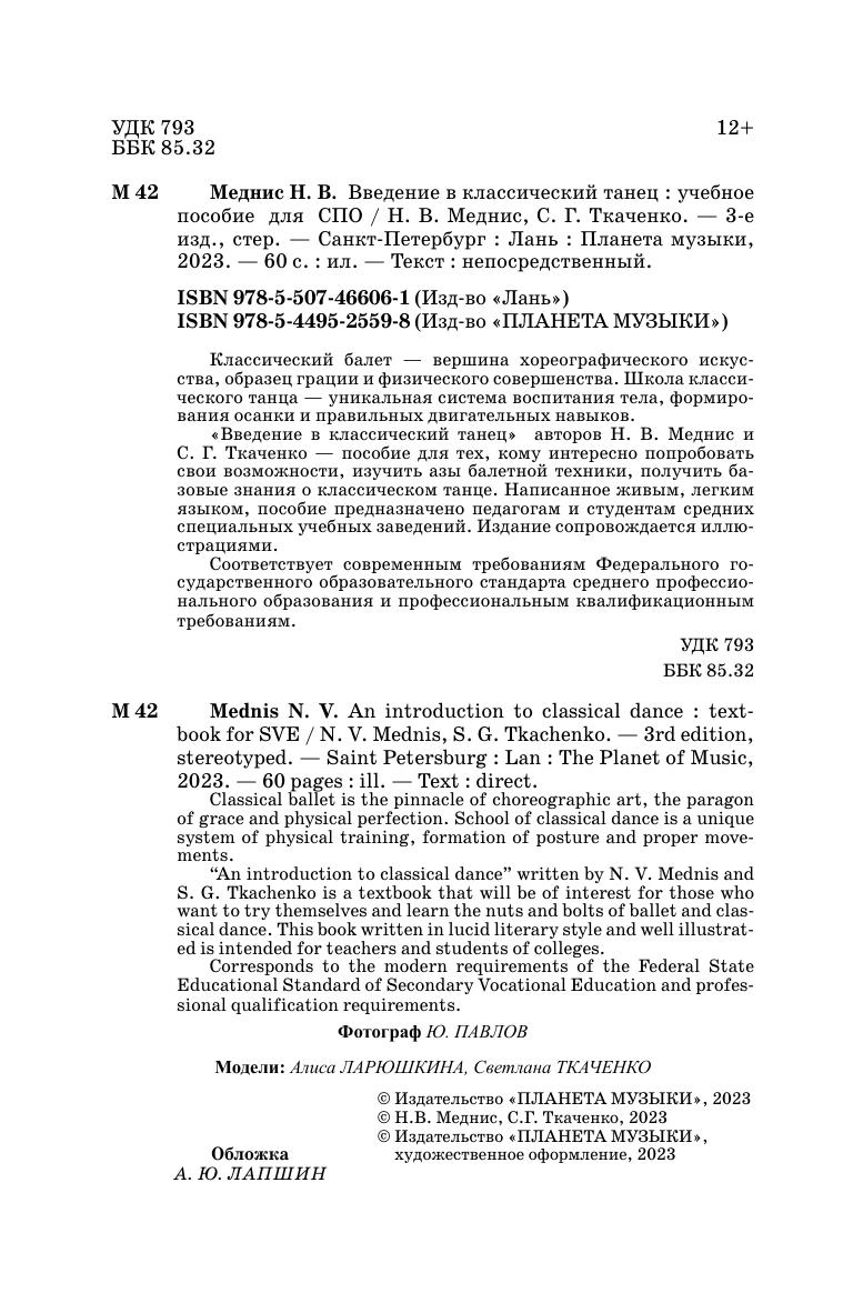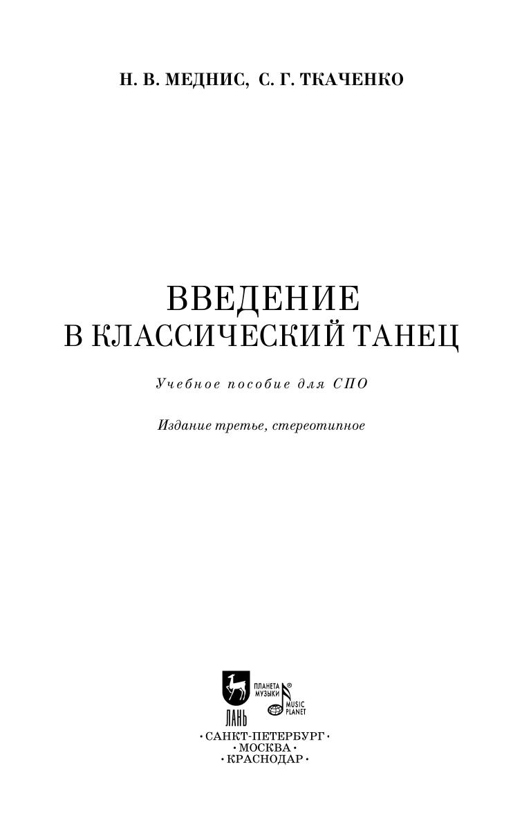 Классический балет — вершина хореографического искусства, образец грации и физического совершенства. Школа классического танца — уникальная система воспитания тела, формирования осанки и правильных двигательных навыков. «Введение в классический танец» авторов Н. В. Меднис и С. Г. Ткаченко — пособие для тех, кому интересно попробовать свои возможности, изучить азы балетной техники, получить базовые знания о классическом танце. Написанное живым, легким языком, пособие предназначено педагогам и студентам средних специальных учебных заведений. Издание сопровождается иллюстрациями. Соответствует современным требованиям Федерального государственного образовательного стандарта среднего профессионального образования и профессиональным квалификационным требованиям. Classical ballet is the pinnacle of choreographic art, the paragon of grace and physical perfection. School of classical dance is a unique system of physical training, formation of posture and proper movements. “An introduction to classical dance” written by N. V. Mednis and S. G. Tkachenko is a textbook that will be of interest for those who want to try themselves and learn the nuts and bolts of ballet and classical dance. This book written in lucid literary style and well illustrated is intended for teachers and students of colleges. Corresponds to the modern requirements of the Federal State Educational Standard of Secondary Vocational Education and professional qualification requirements.