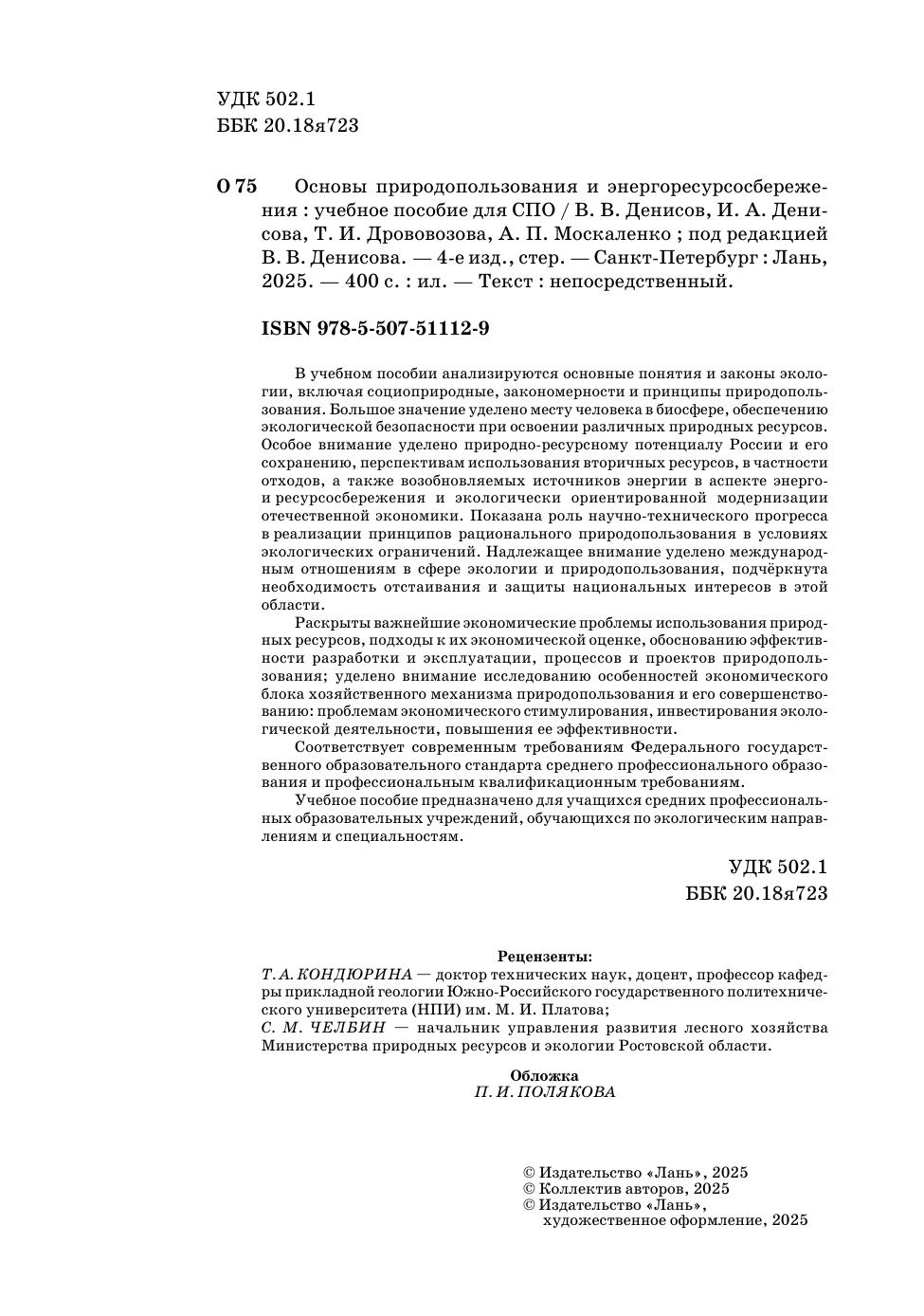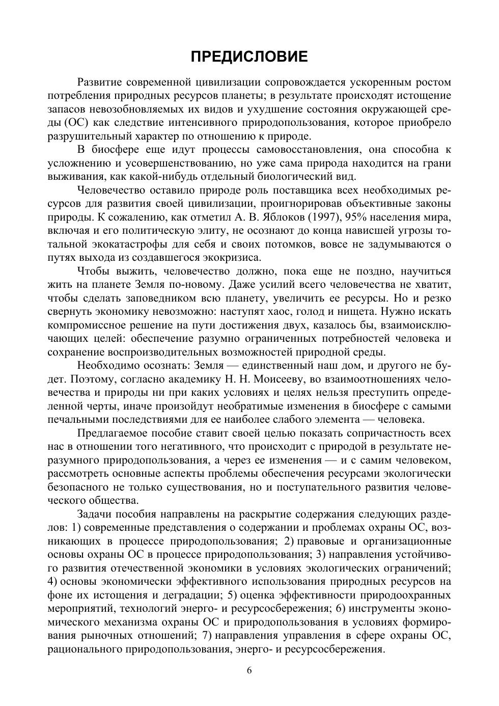 В учебном пособии анализируются основные понятия и законы экологии, включая социоприродные, закономерности и принципы природопользования. Большое значение уделено месту человека в биосфере, обеспечению экологической безопасности при освоении различных природных ресурсов. Особое внимание уделено природно-ресурсному потенциалу России и его сохранению, перспективам использования вторичных ресурсов, в частности отходов, а также возобновляемых источников энергии в аспекте энерго- и ресурсосбережения и экологически ориентированной модернизации отечественной экономики. Показана роль научно-технического прогресса в реализации принципов рационального природопользования в условиях экологических ограничений. Надлежащее внимание уделено международным отношениям в сфере экологии и природопользования, подчёркнута необходимость отстаивания и защиты национальных интересов в этой области. Раскрыты важнейшие экономические проблемы использования природных ресурсов, подходы к их экономической оценке, обоснованию эффективности разработки и эксплуатации, процессов и проектов природопользования, уделено внимание исследованию особенностей экономического блока хозяйственного механизма природопользования и его совершенствованию: проблемам экономического стимулирования, инвестирования экологической деятельности, повышения ее эффективности. Соответствует современным требованиям Федерального государственного образовательного стандарта среднего профессионального образования и профессиональным квалификационным требованиям. Учебное пособие предназначено для учащихся средних профессиональных образовательных учреждений, обучающихся по экологическим направлениям и специальностям.