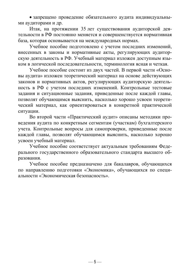 Аудит — важнейший элемент рыночной экономики. Без проведения независимого финансового контроля — аудита — невозможно оценить финансовое положение, финансовые результаты и движение денежных средств экономического субъекта. Что такое аудит и как его проводить — рассказывается в данном пособии. Оно состоит из двух частей. В первой части изложен теоретический материал, раскрывающий сущность аудита с опорой на действующие законы и нормативные акты, регулирующие аудиторскую деятельность в РФ. Во второй части описаны практические методики проведения аудита по конкретным сегментам бухгалтерского учета. Контрольные вопросы для самопроверки, приведенные после каждой главы, позволят обучающимся выяснить, насколько хорошо усвоен изученный материал. Пособие подготовлено с учетом последних изменений, внесенных в законы и нормативные акты, касающиеся проведения аудиторской деятельности в Российской Федерации. Учебное пособие предназначено для бакалавров, обучающихся по направлению подготовки «Экономика», и студентов, обучающихся по специальности «Экономическая безопасность».