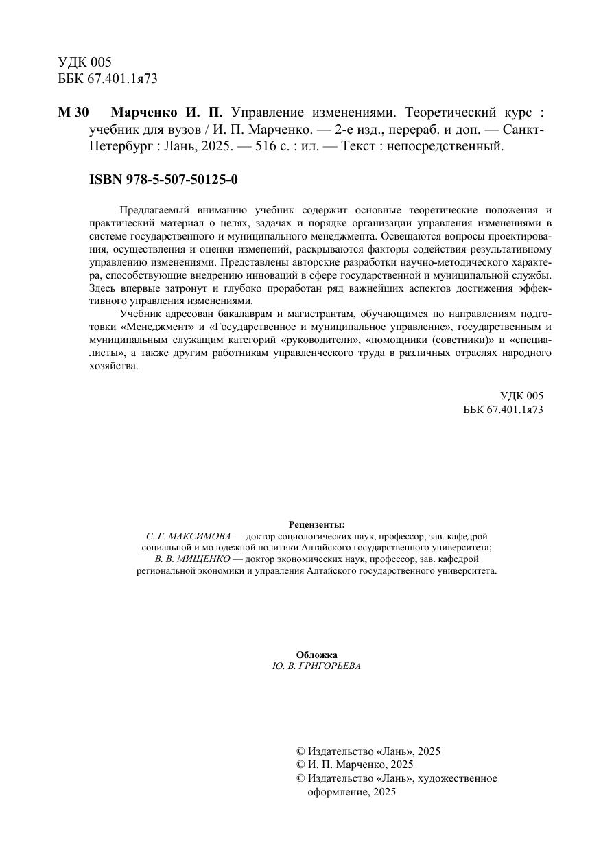 Предлагаемый вниманию учебник содержит основные теоретические положения и практический материал о целях, задачах и порядке организации управления изменениями в системе государственного и муниципального менеджмента. Освещаются вопросы проектирования, осуществления и оценки изменений, раскрываются факторы содействия результативному управлению изменениями. Представлены авторские разработки научно-методического характера, способствующие внедрению инноваций в сфере государственной и муниципальной службы. Здесь впервые затронут и глубоко проработан ряд важнейших аспектов достижения эффективного управления изменениями. Учебник адресован бакалаврам и магистрантам, обучающимся по направлениям подготовки «Менеджмент» и «Государственное и муниципальное управление», государственным и муниципальным служащим категорий «руководители», «помощники (советники)» и «специалисты», а также другим работникам управленческого труда в различных отраслях народного хозяйства.