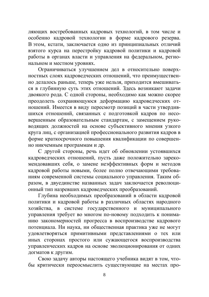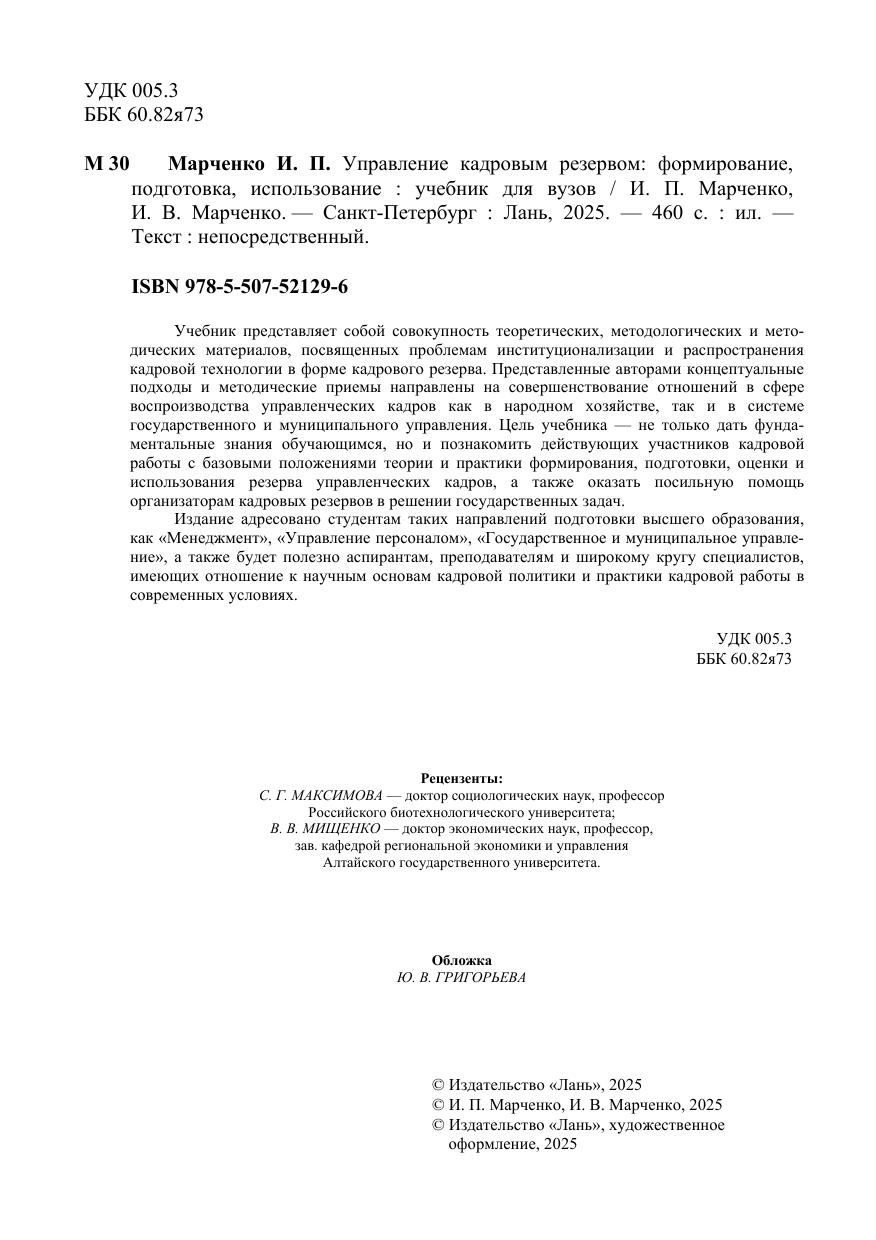 Учебник представляет собой совокупность теоретических, методологических и методических материалов, посвященных проблемам институционализации и распространения кадровой технологии в форме кадрового резерва. Представленные авторами концептуальные подходы и методические приемы направлены на совершенствование отношений в сфере воспроизводства управленческих кадров как в народном хозяйстве, так и в системе государственного и муниципального управления. Цель учебника — не только дать фундаментальные знания обучающимся, но и познакомить действующих участников кадровой работы с базовыми положениями теории и практики формирования, подготовки, оценки и использования резерва управленческих кадров, а также оказать посильную помощь организаторам кадровых резервов в решении государственных задач. Издание адресовано студентам таких направлений подготовки высшего образования, как «Менеджмент», «Управление персоналом», «Государственное и муниципальное управление», а также будет полезно аспирантам, преподавателям и широкому кругу специалистов, имеющих отношение к научным основам кадровой политики и практики кадровой работы в современных условиях.